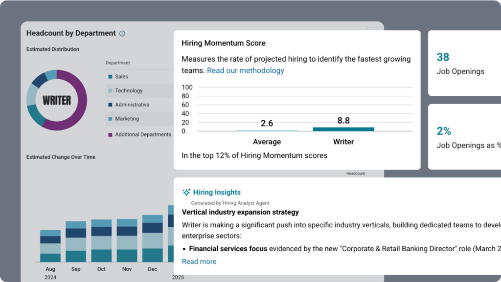 Reveals strategic signals based on private and public company hiring activity – including team expansions, GTM shifts, and early changes in product direction.
