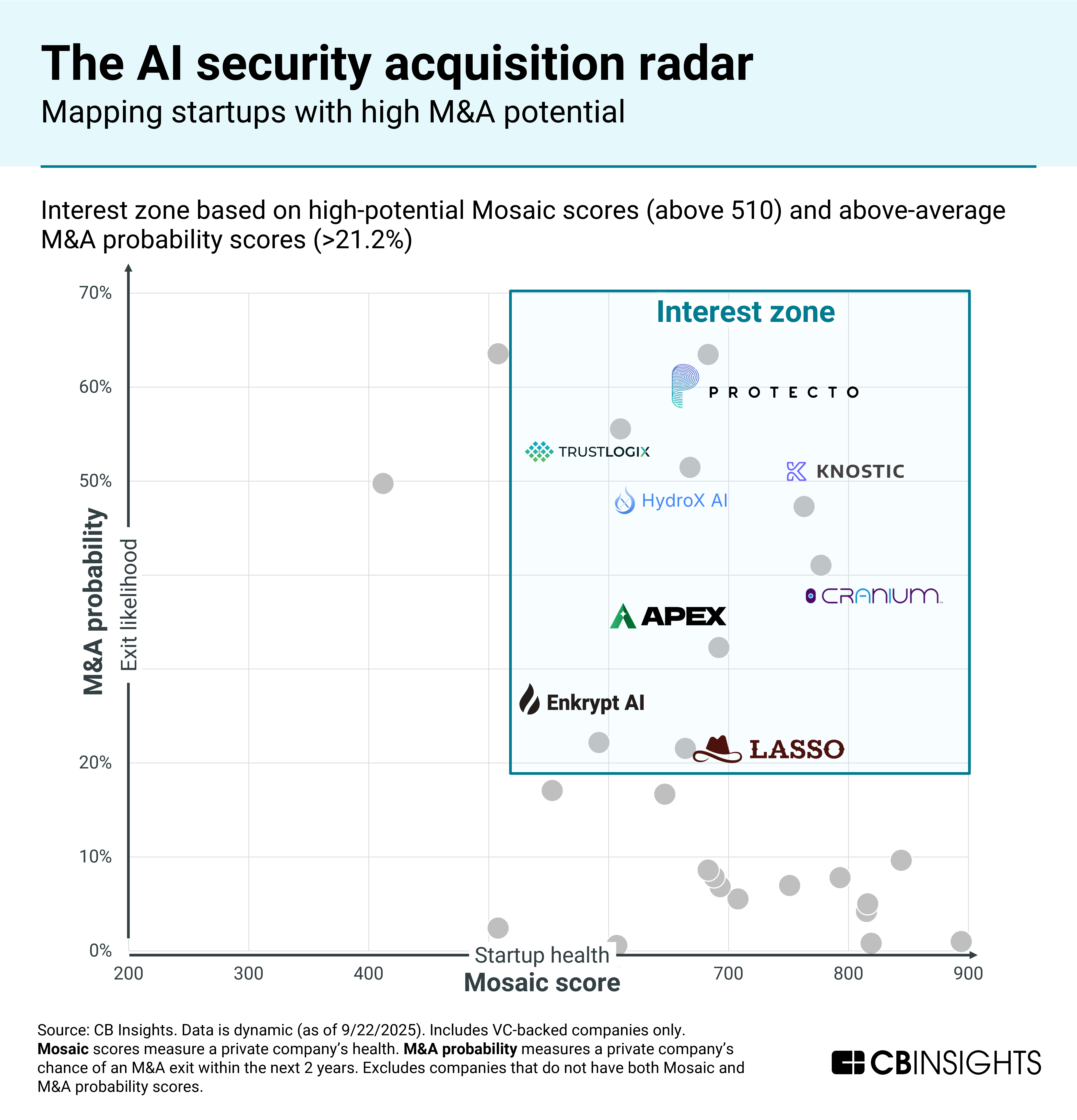 TrustLogix is among the AI security startups most likely to be acquired next, according to CB Insights Predictive Intelligence, as large cyber players have been on a M&A spree to seize this opportunity and integrate AI security features into existing offerings.