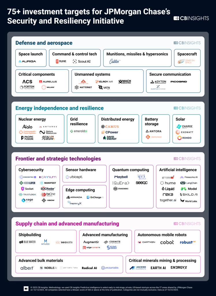 We map them all below, categorized across all but 4 of the strategic areas identified by JPMorgan Chase due to a lack of promising startups matching our criteria — full methodology available at the end of this report. Key recommendations follow.