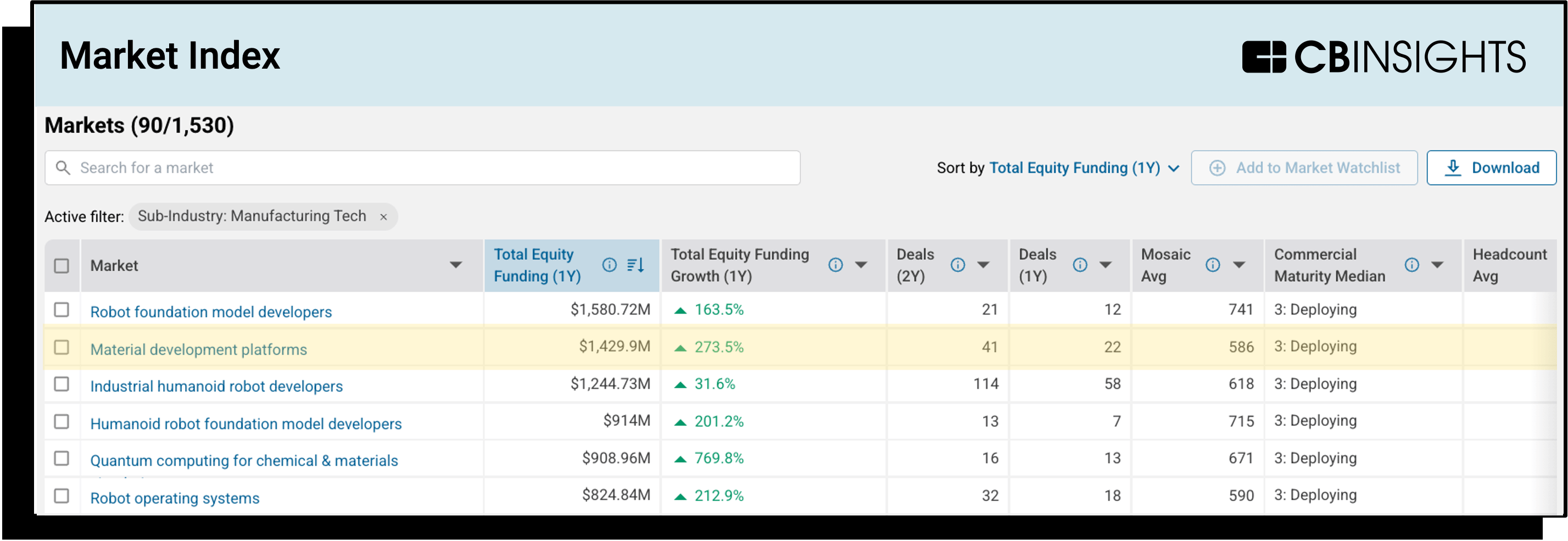 Meanwhile, Earth AI and Periodic Labs are applying AI to accelerate materials discovery and secure domestic access to critical minerals and battery inputs. Material development platforms have recently captured investor attention as AI and quantum computing unlock new capabilities, becoming one of the hottest emerging markets (i.e., with a Commercial Maturity median of 3 or below) in the manufacturing sector.