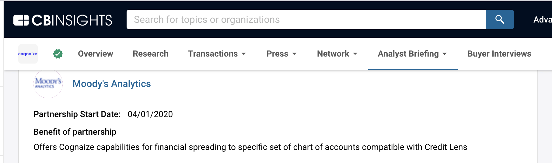 Once you’ve built your shortlist, drill down further by using CB Insights company profiles to dig into each company’s business relationships — which encompass partnerships, licensing agreements, customers, joint ventures, and other alliances.