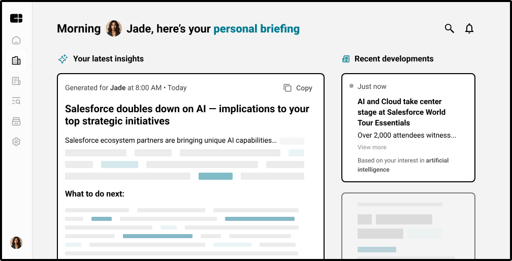 Decision-makers are drowning in information. Missing something could mean disaster. Meet your AI-powered personal briefing. It’s like a research team working 24/7 to surface what’s important to you — and what you should do about it.