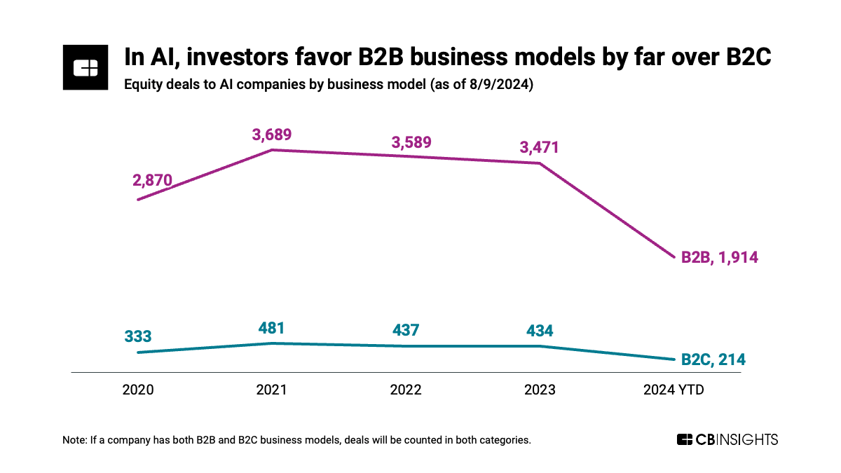 Source: CB Insights — customers can use the CB Insights platform search filters and our business model data to explore both B2B AI deals and B2C AI deals