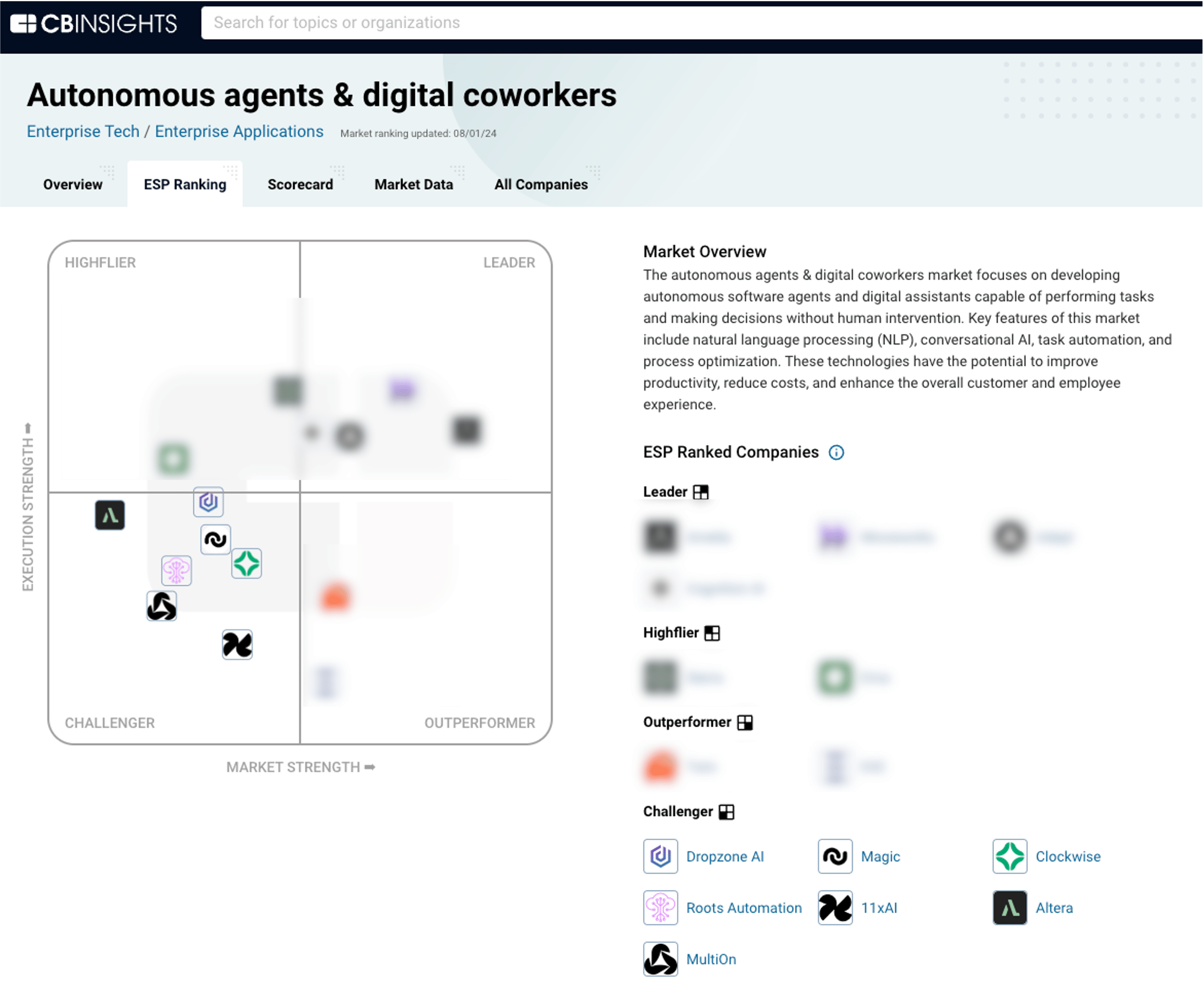 - Personal AI assistants and chatbots: This includes chatbots from some of the top-funded companies in the space (Anthropic, xAI) as well as early-stage agent startups (MultiOn, Altera). Both Altera and MultiOn are featured in our autonomous agents market on the CB Insights platform.
