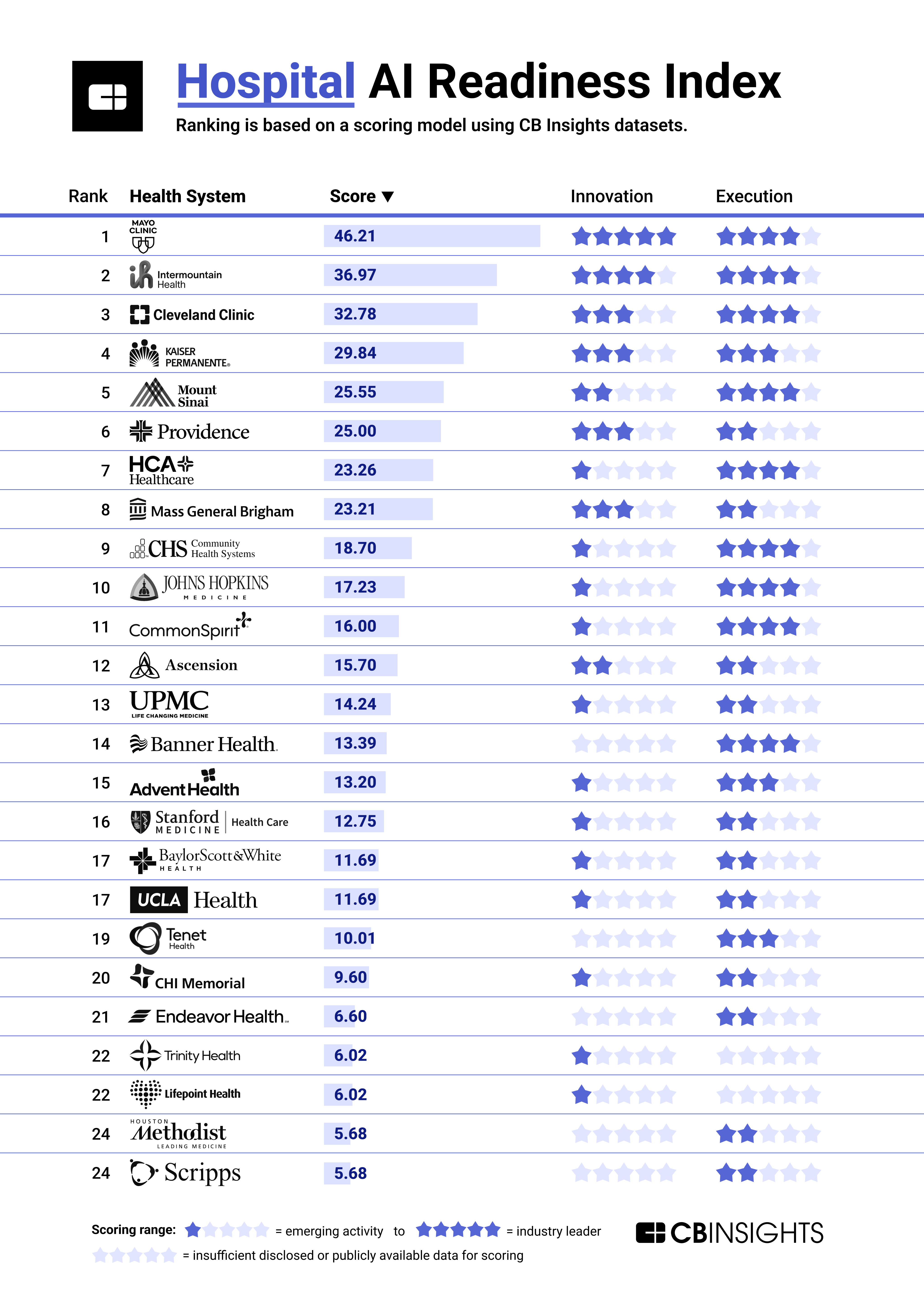 - Execution: The execution score measures a health system’s ability to bring AI-powered products and services into clinical practice as well as deploy AI internally across business and back-office functions. This score is based on CB Insights data including business relationships, product launch media mentions, and earnings transcripts.