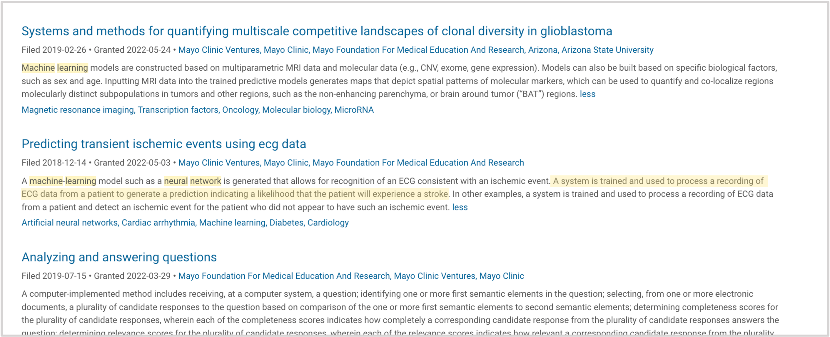One focus area for Mayo Clinic is cardiovascular health. For example, in 2022, it was granted a patent for a system that uses a machine learning model to analyze electrocardiogram (ECG) data and predict the likelihood that a patient will have a stroke.