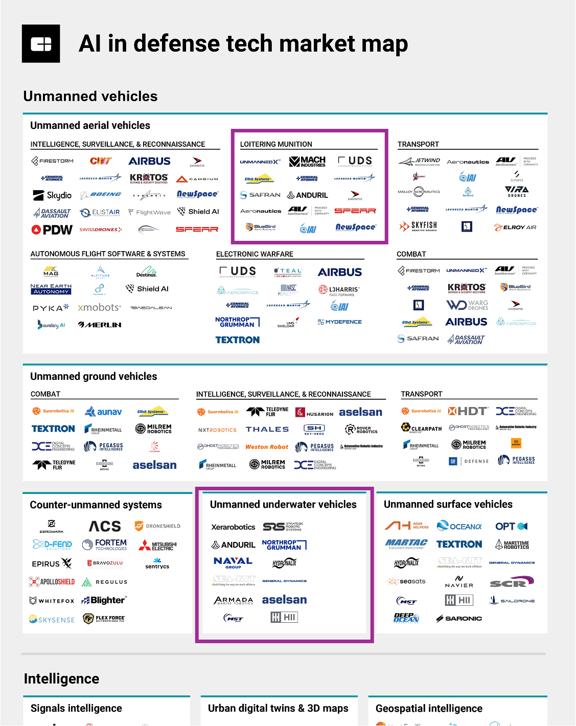 We featured Anduril in several areas of our recent AI in defense tech market map. Customers can use the below links to see how Anduril stacks up against competitors in these markets: