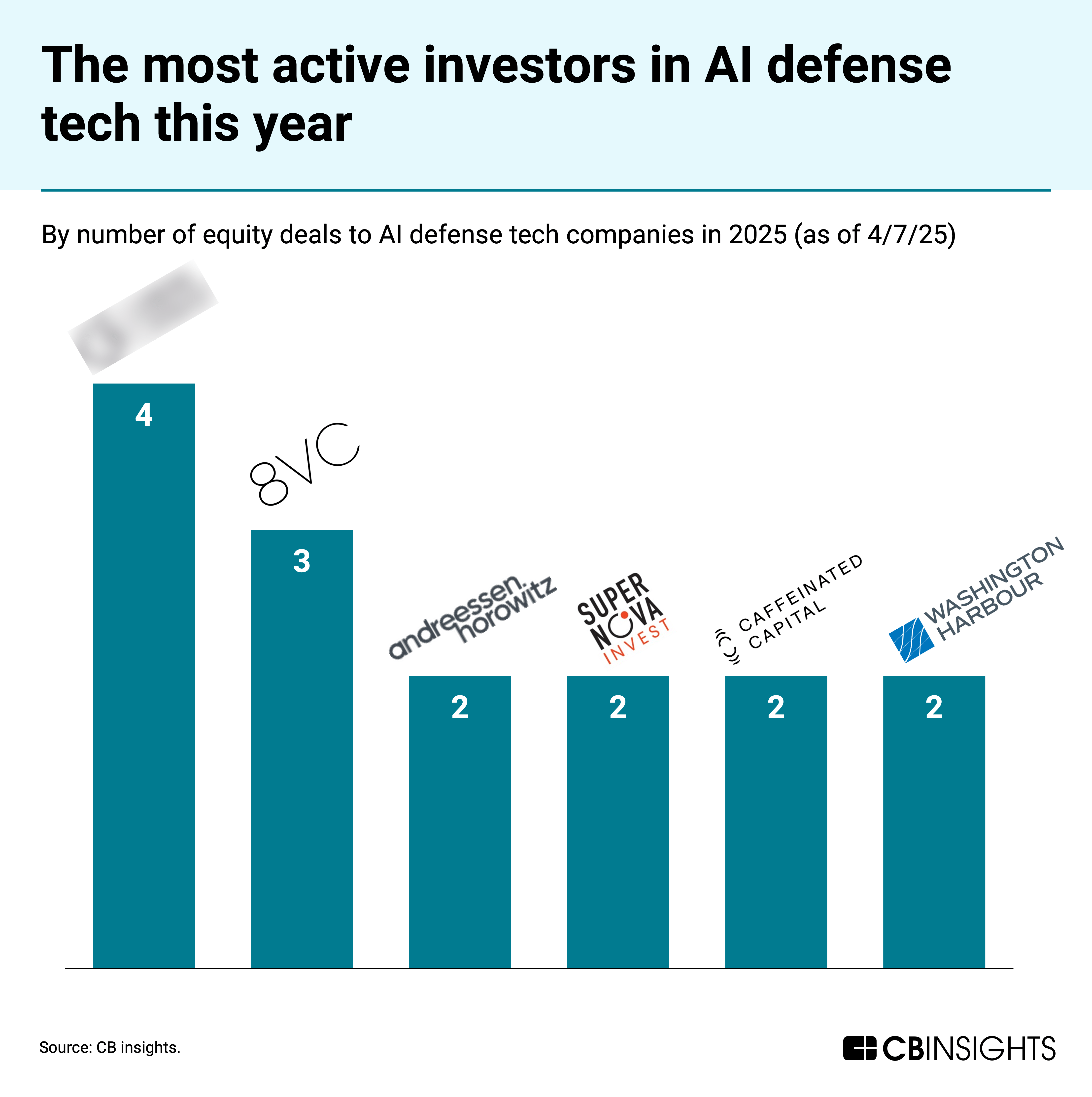8VC and a16z rank among the top investors in AI defense tech this year — but they’re outpaced by one peer who has already backed 4 AI defense tech companies in 2025.