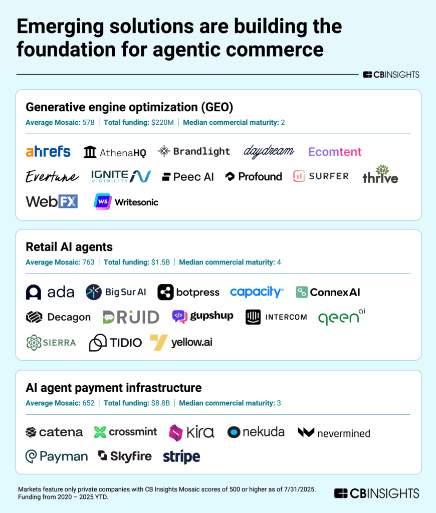 Using CB Insights’ Business Graph, which connects data across private investments, partnerships, and public company moves, we surfaced the key signals showing how startups and incumbents are building the infrastructure for agentic commerce.