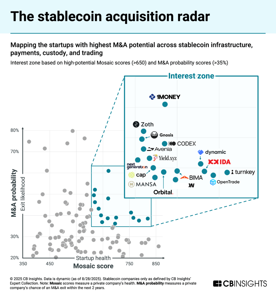 All companies in our stablecoin acquisition radar have above-average M&A probability (greater than 20%) and Mosaic scores (greater than 370).
