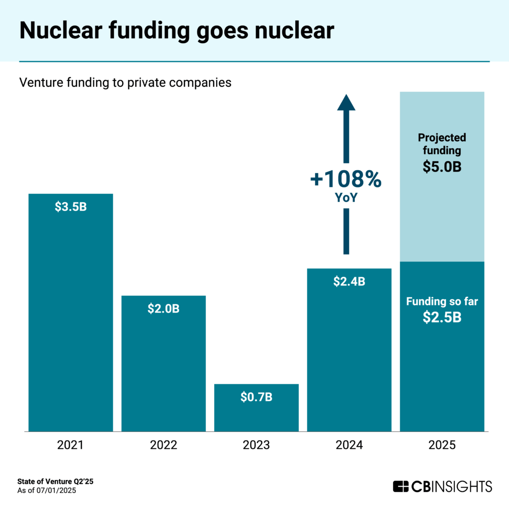Funding to nuclear energy companies is projected to reach an annual record by the end of 2025 at $5B. Massive energy requirements for AI data centers — with US data center power consumption projected to triple by 2030 — are driving corporate interest in clean baseload power.