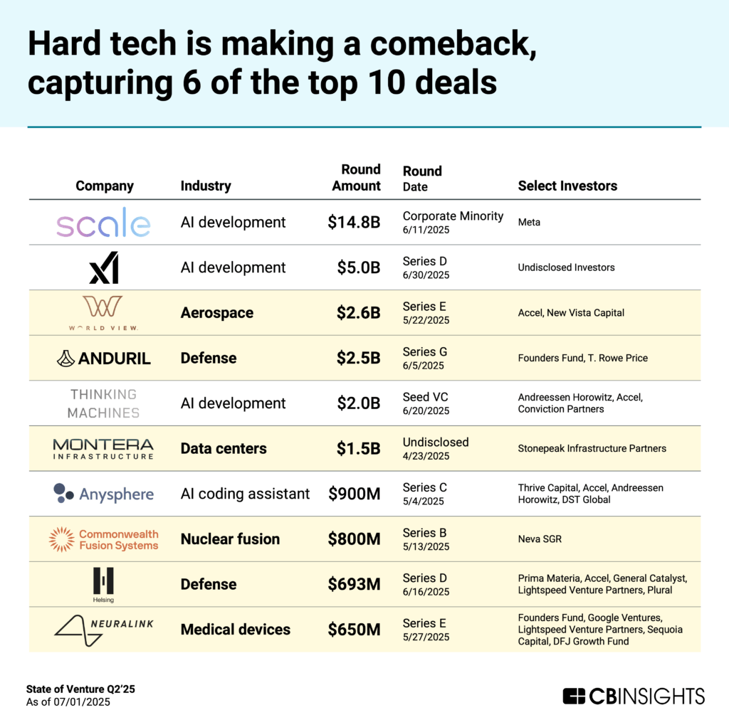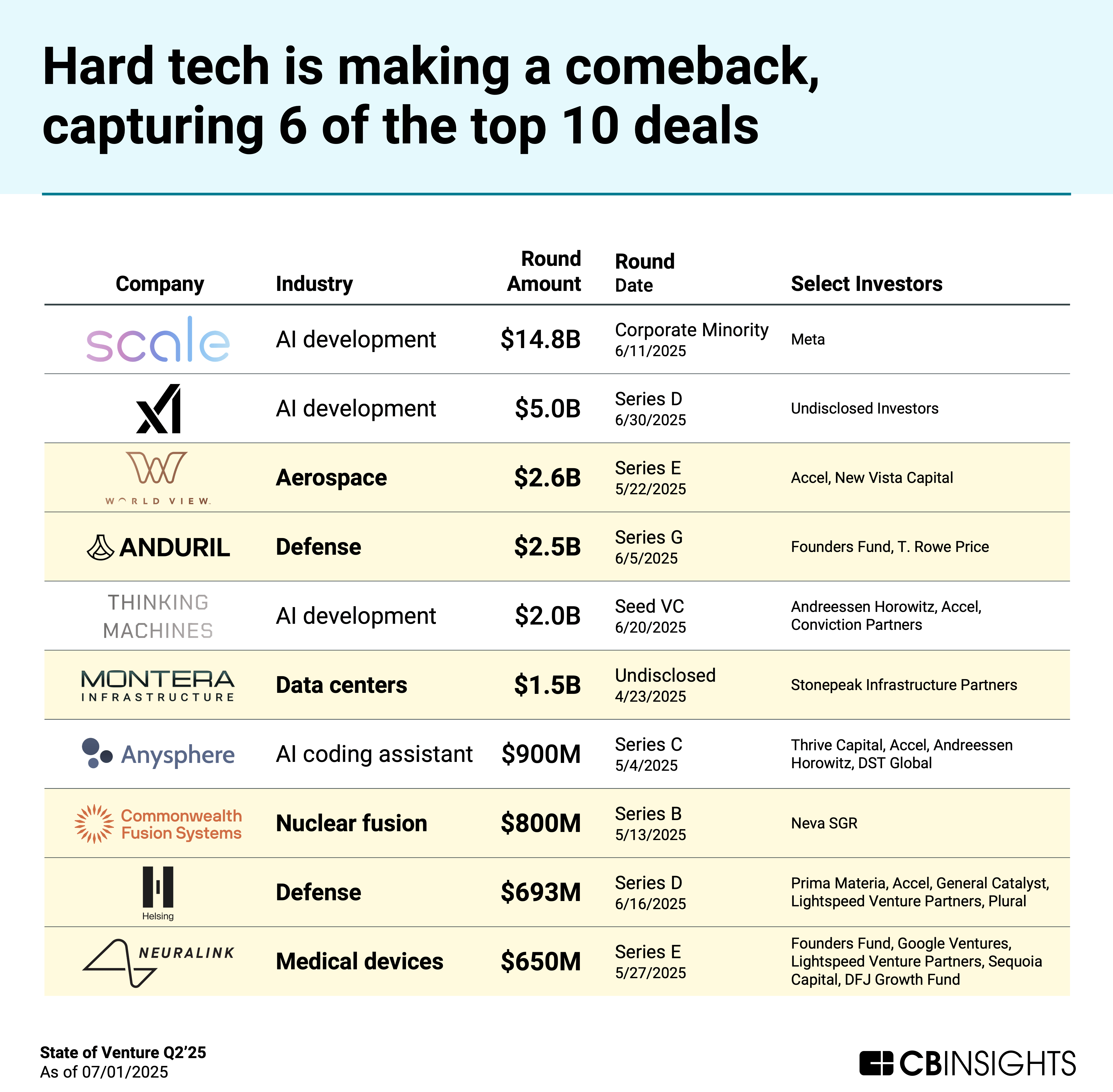 Six of the 10 largest deals in Q2’25 went to hard tech companies, which are firms building capital-intensive physical products.