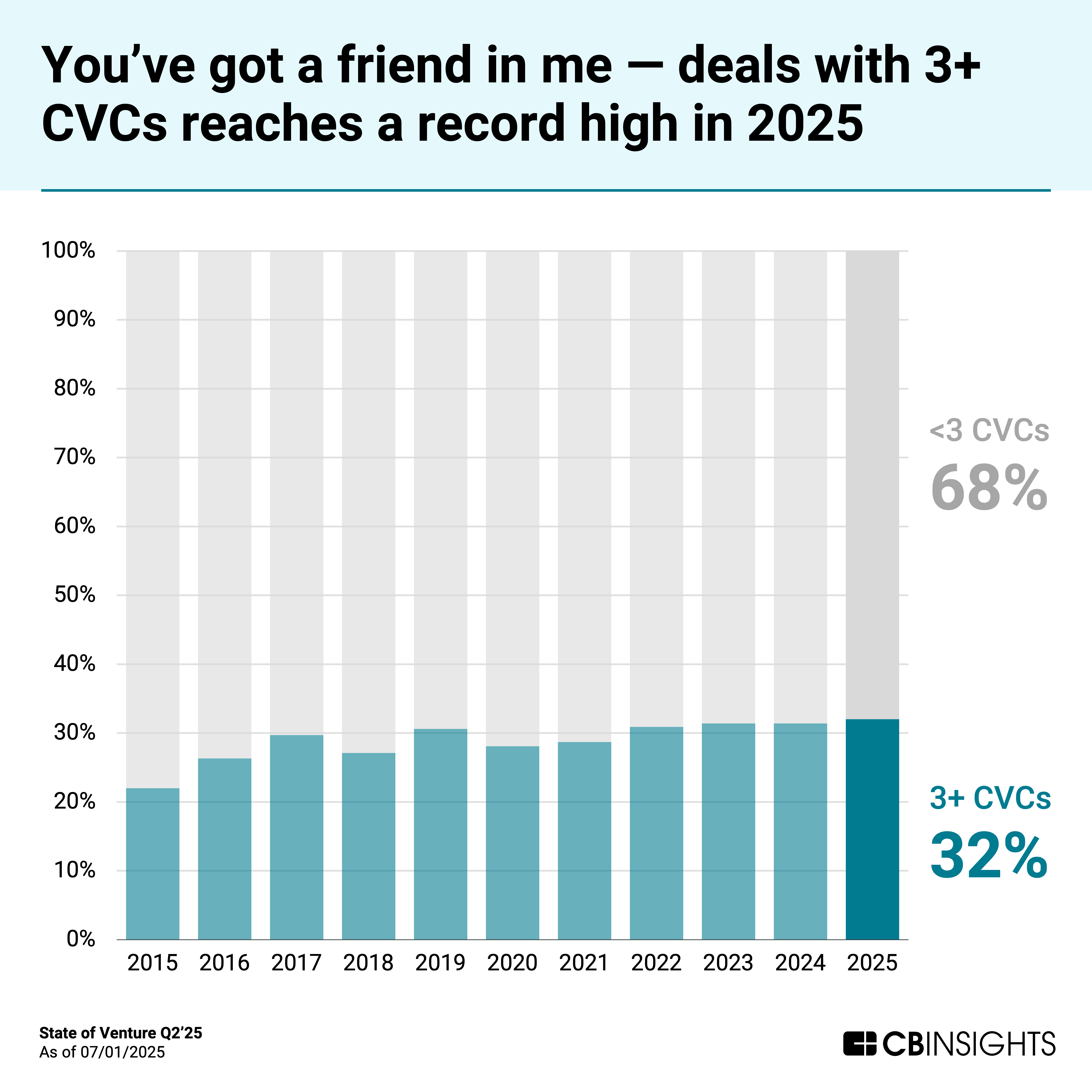 CVCs are also collaborating more frequently. Deals involving 3+ CVCs reached a record high of 32% in Q2’25, reflecting both strategic necessity and market conditions: larger funding rounds in capital-intensive sectors like AI and hard tech may require multiple corporate partners to provide sufficient capital. At the same time, competition for access to the hottest technologies drives CVCs to team up rather than risk being shut out.