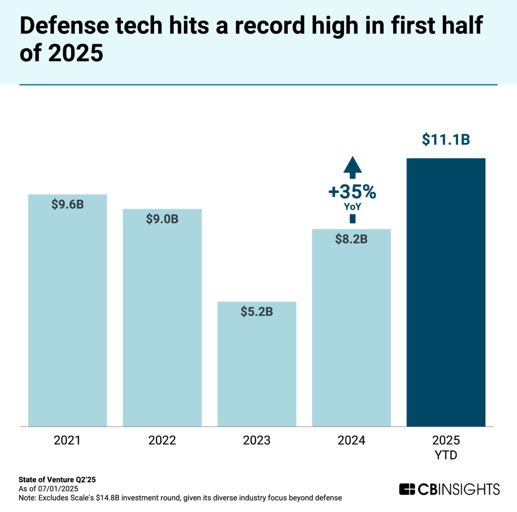 Within the first two quarters of 2025, defense tech funding has already reached a new annual record of $11.1B.