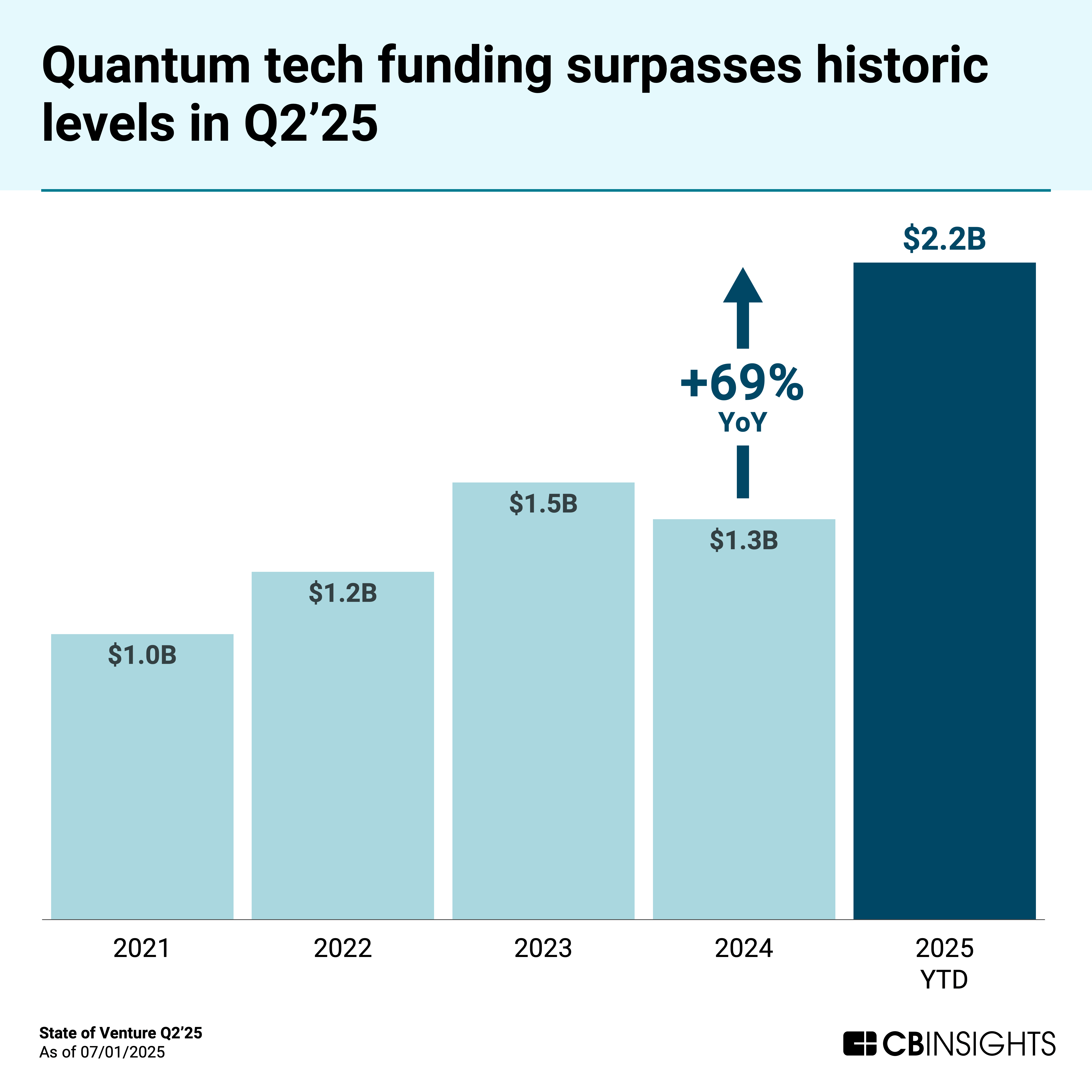 Quantum tech is attracting significant investor interest, reaching record annual funding levels at $2.2B within the first two quarters of 2025 — an increase of 69% from 2024.