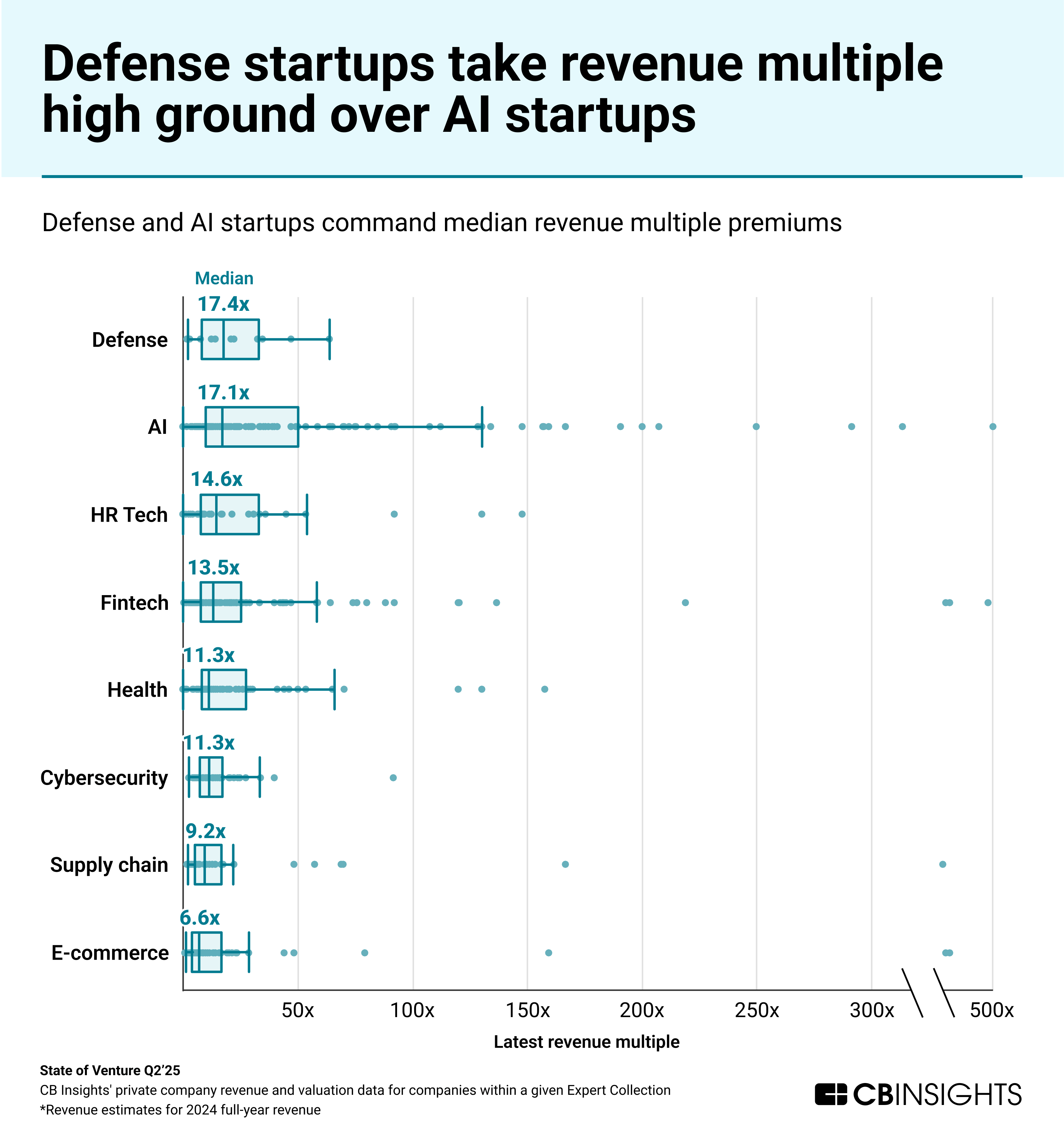 Across the board, defense tech startups are now commanding a median revenue multiple of 17.4x, edging out AI companies at 17.1x and all other major sectors. This signals high investor confidence and competition, driving premium valuations across the defense tech sector.