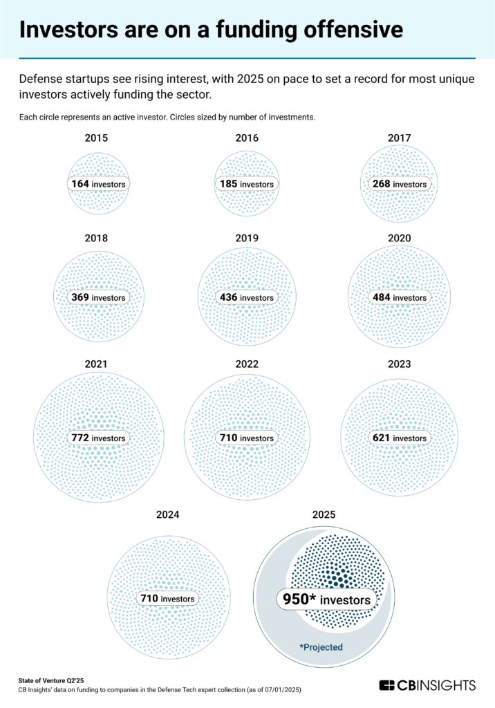 The defense investor landscape is also rapidly evolving, with the number of unique investors in the space expected to increase 34% in 2025 to 950 from 710 the year prior. Traditional defense funds like Shield Capital and In-Q-Tel are now joined by generalist VCs, bringing more capital to fund a new generation of startups.