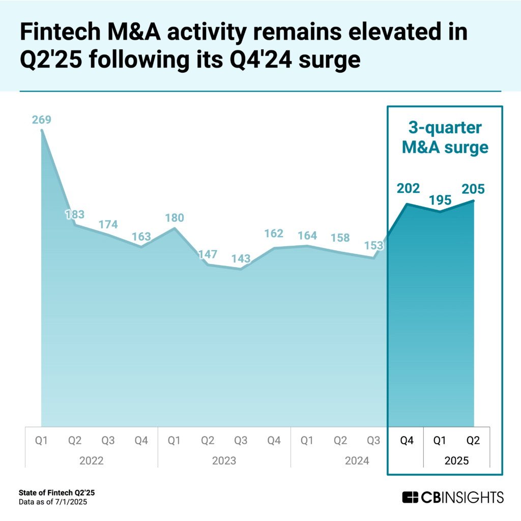 Fintech M&A deals rose to 205 in Q2’25, following a significant increase in Q4’24.