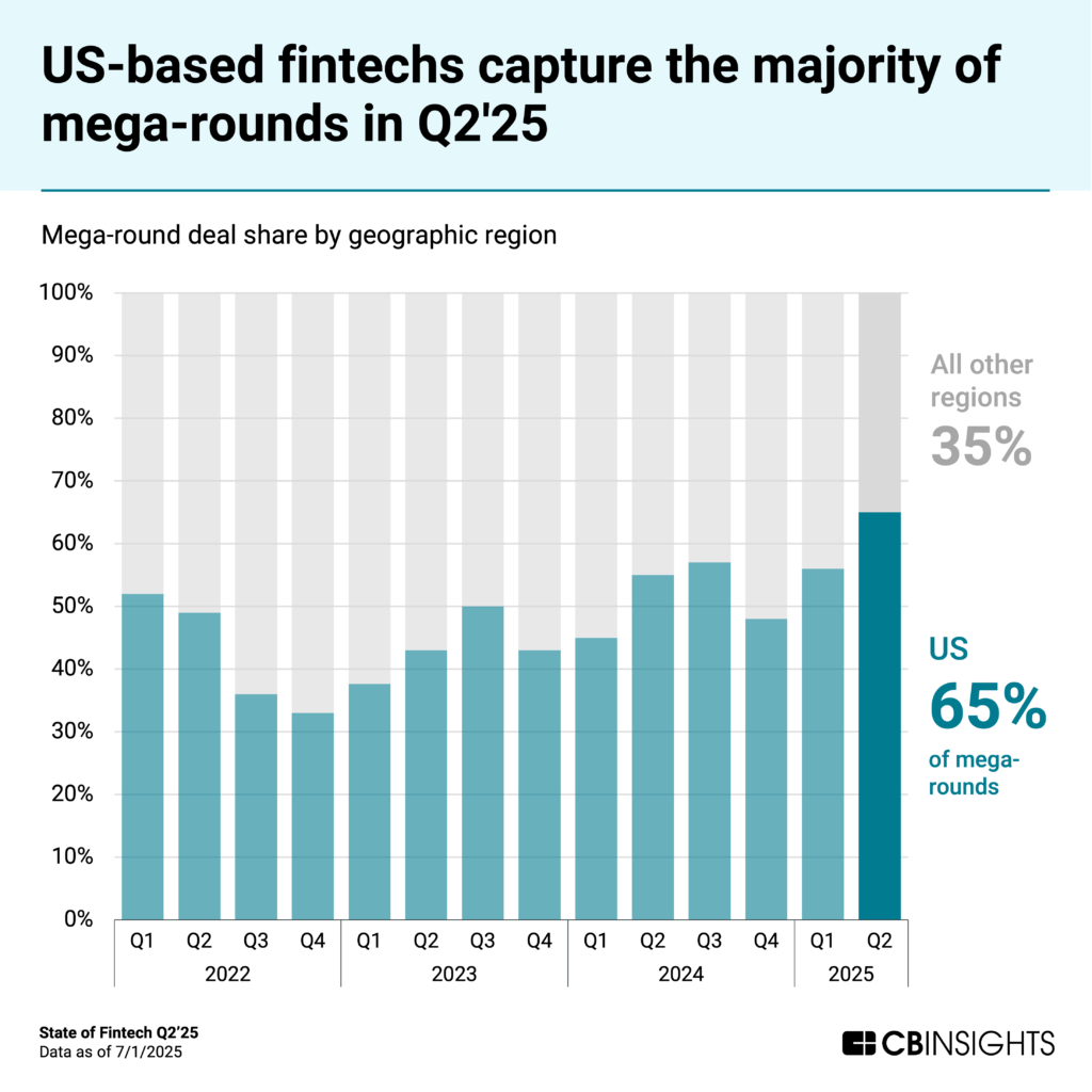 US-based companies captured 65% of mega-rounds in Q2’25 — the highest share on record. US fintechs also secured 71% of all mega-round funding.