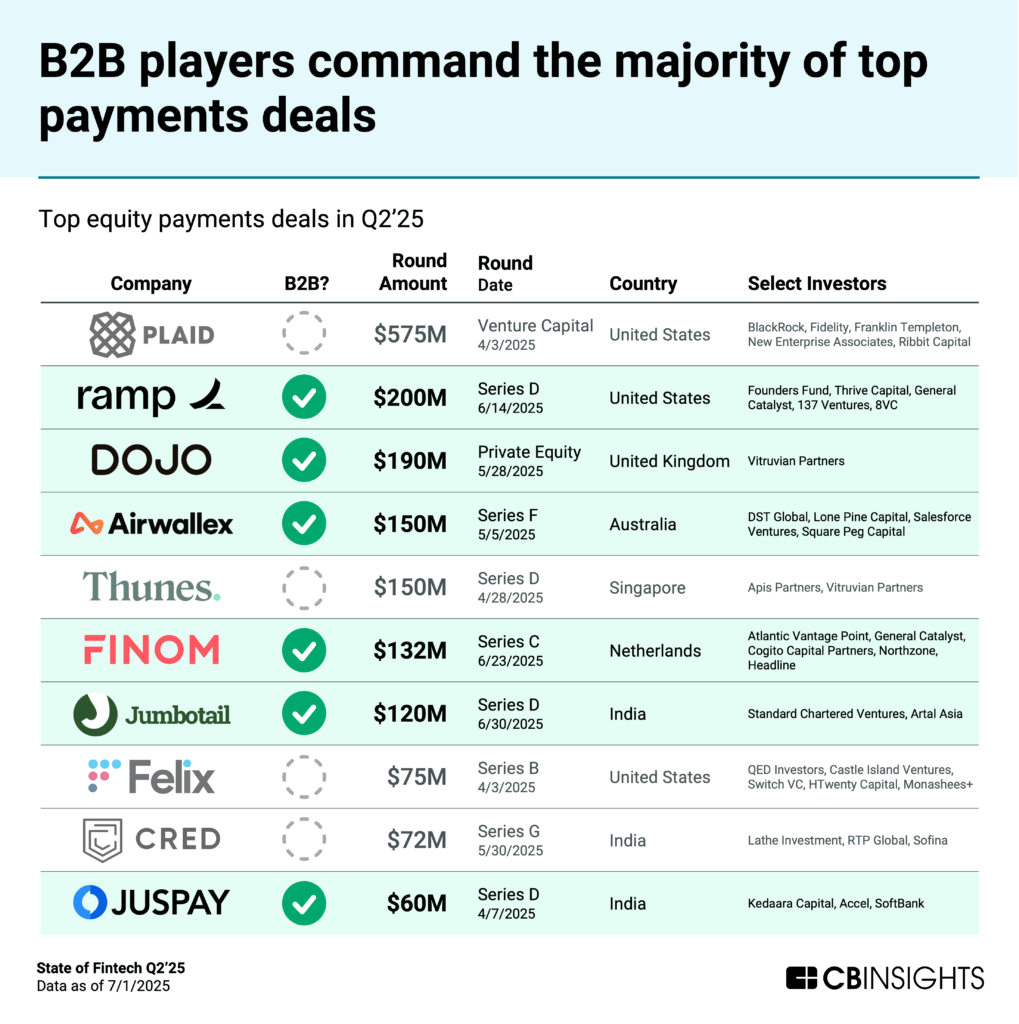 - B2B fintech attracts the majority of large deals. B2B fintech companies brought in 60% of the largest payments investments and 50% of the largest banking rounds in Q2’25, led by Ramp‘s $200M Series D and Dojo‘s $190M private equity round. The pattern signals a growing appetite for business-facing fintech platforms over consumer-oriented applications.
