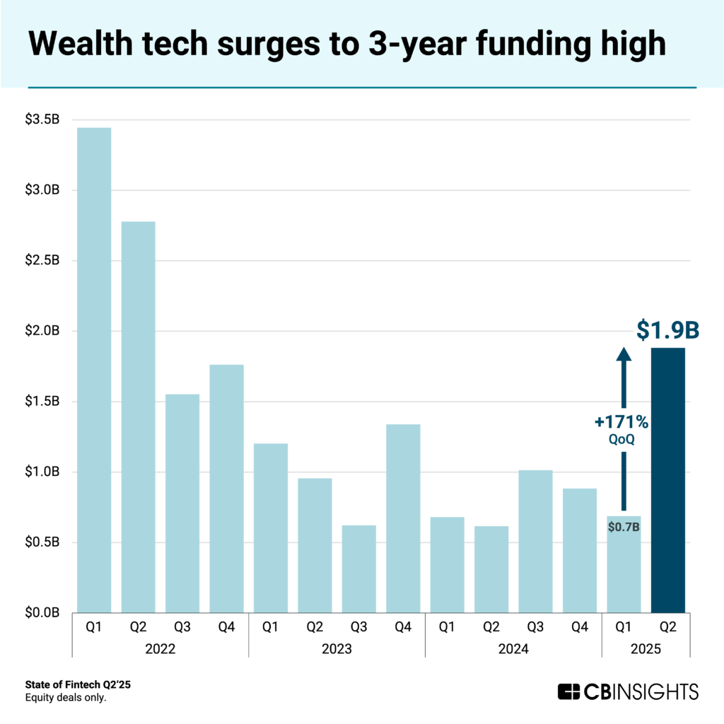 - Digital wealth management is seeing a dramatic funding revival. Q2’25 marked a turning point for wealth tech with $1.9B in funding — nearly triple the Q1 number of $0.7B and the sector’s strongest performance in 3 years. Large deals like Addepar‘s $230M Series G round and Groww‘s $200M Series F drove both average and median deal sizes higher
