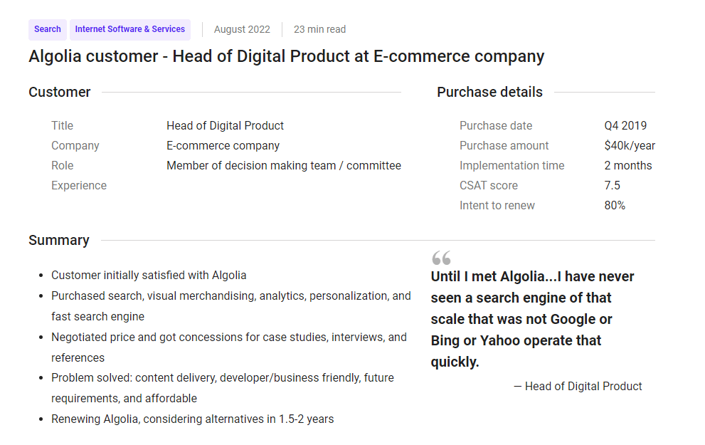 The result of this structured interview process is that you are armed with consistent data and insight that comes from talking to many buyers in a particular landscape. Using generative AI, we extract those insights from the conversations so you can go beyond expert opinions to go both deep on a particular company or the market in which it competes.