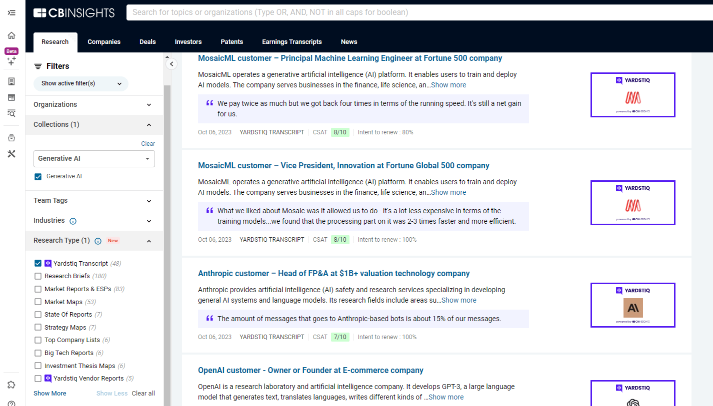 - Reduced reliance on paid expert calls: With firsthand accounts readily available in our transcript library, you can conduct initial research using the CB Insights transcript library and reduce the number of paid expert calls, resulting in significant cost savings.