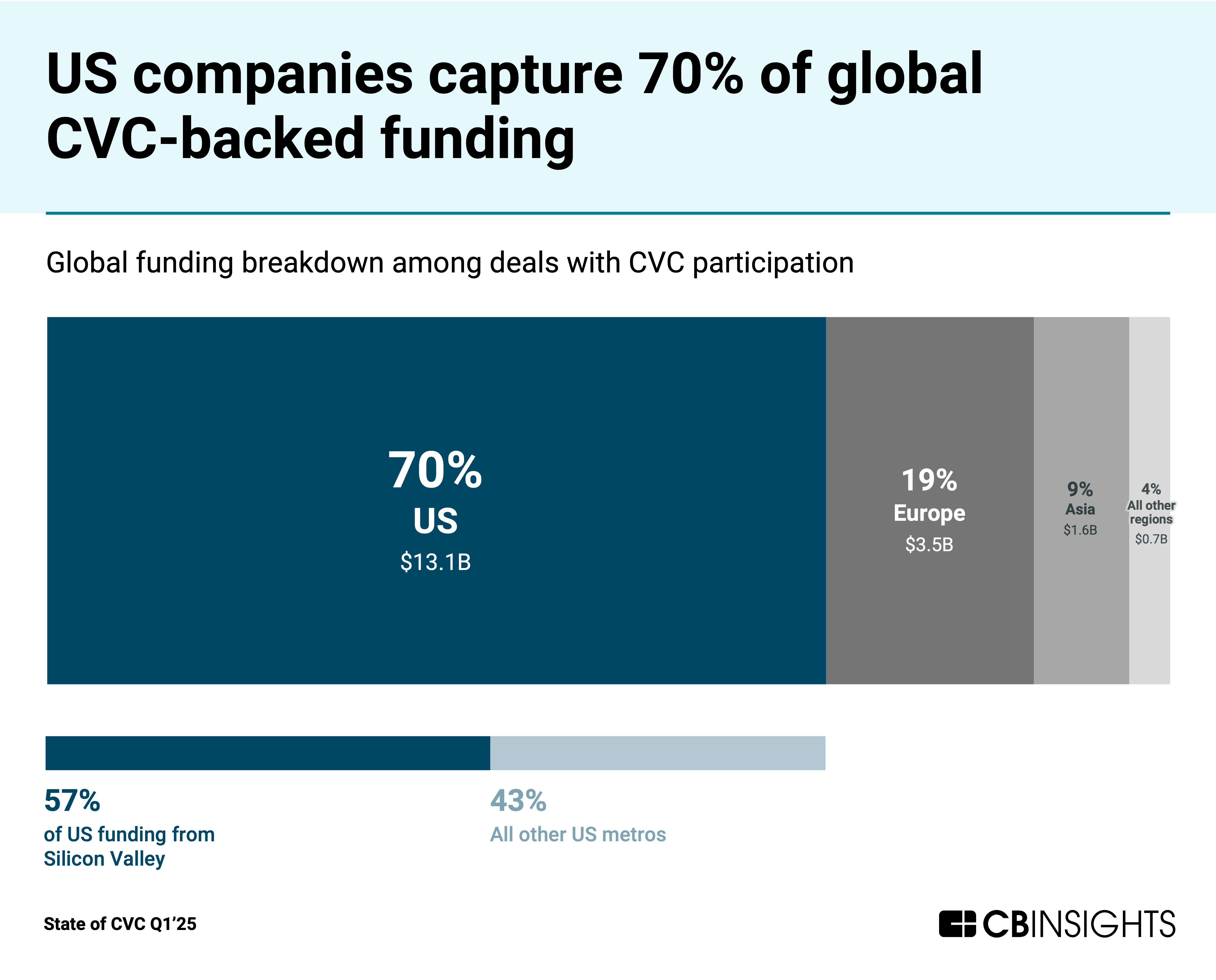 - US companies dominate CVC investment dollars. In Q1’25, US startups captured $13.1B (or 70%) of global funding from deals with CVC participation. Within the US, Silicon Valley maintained its leading position with $7.5B across 97 deals, underscoring its continued importance as a strategic hub for corporate investment.