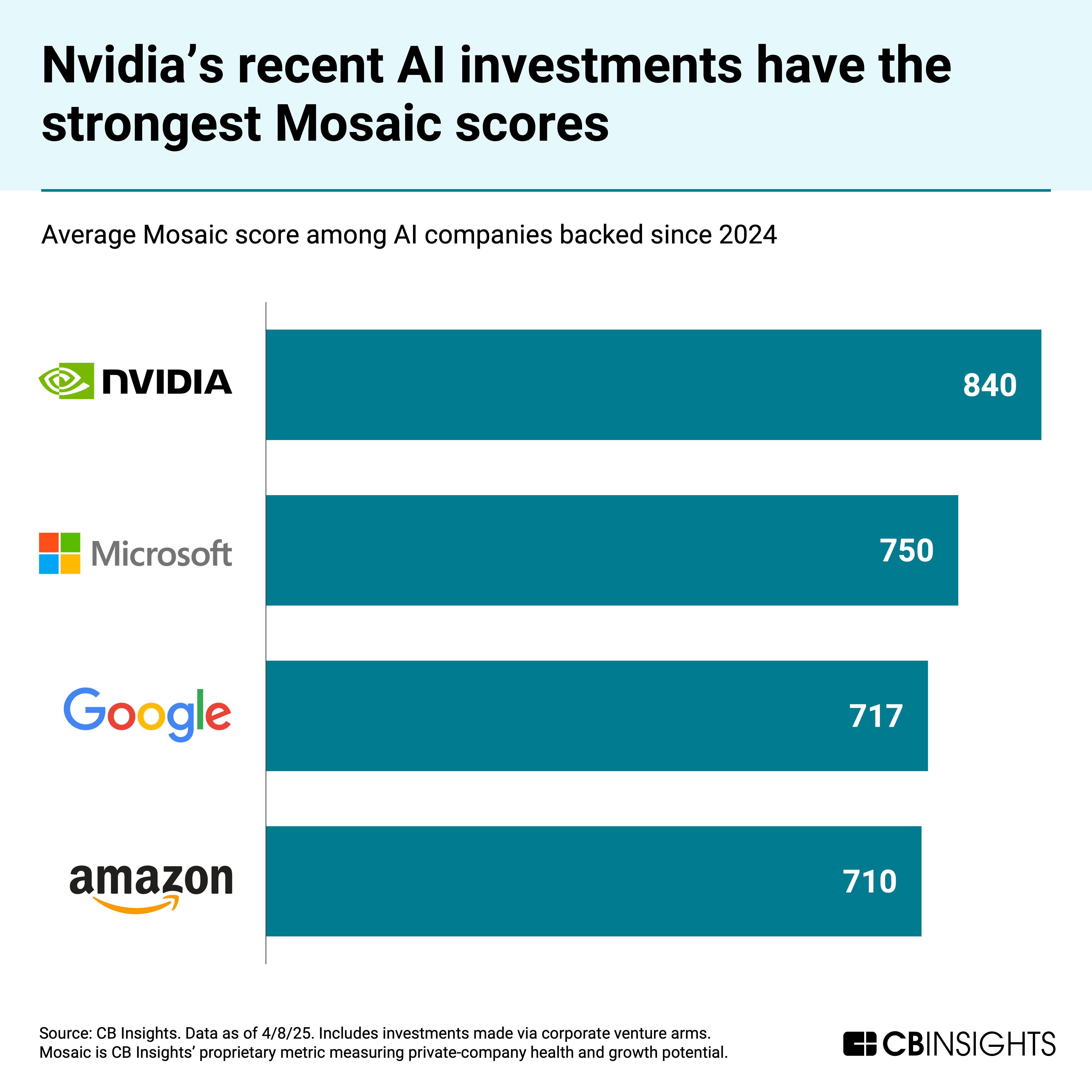 Nvidia also takes the lead when it comes to the strength of its AI startup portfolio. According to CB Insights’ Mosaic scores — which measure private-company health and growth potential, on a scale of 0-1,000 — Nvidia’s AI investments since 2024 come out on top with an average score of 840.