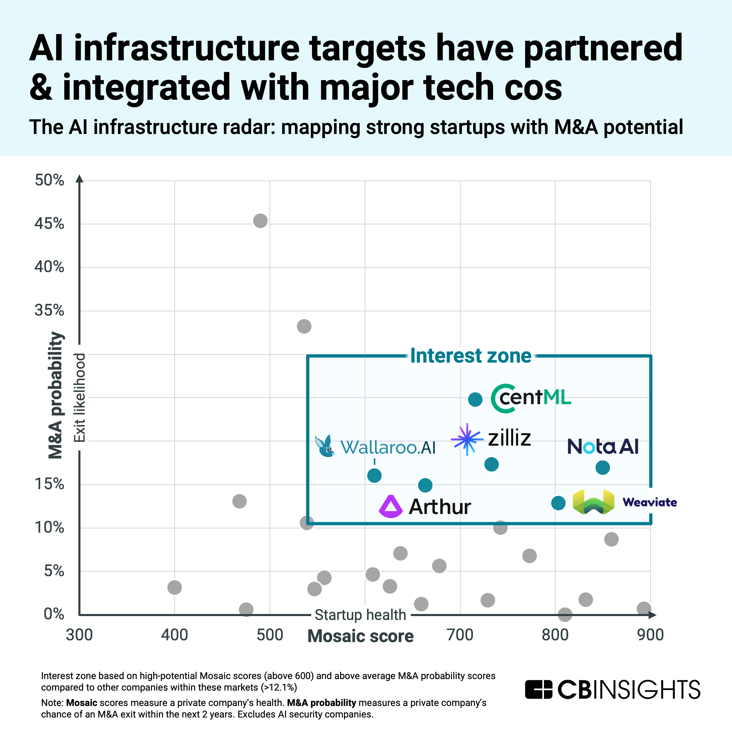 Using CB Insights’ predictive signals, such as Mosaic and M&A Probability, we’ve identified 7 AI-related areas where we expect to see M&A activity this year, as well as high-potential acquisition targets for each.