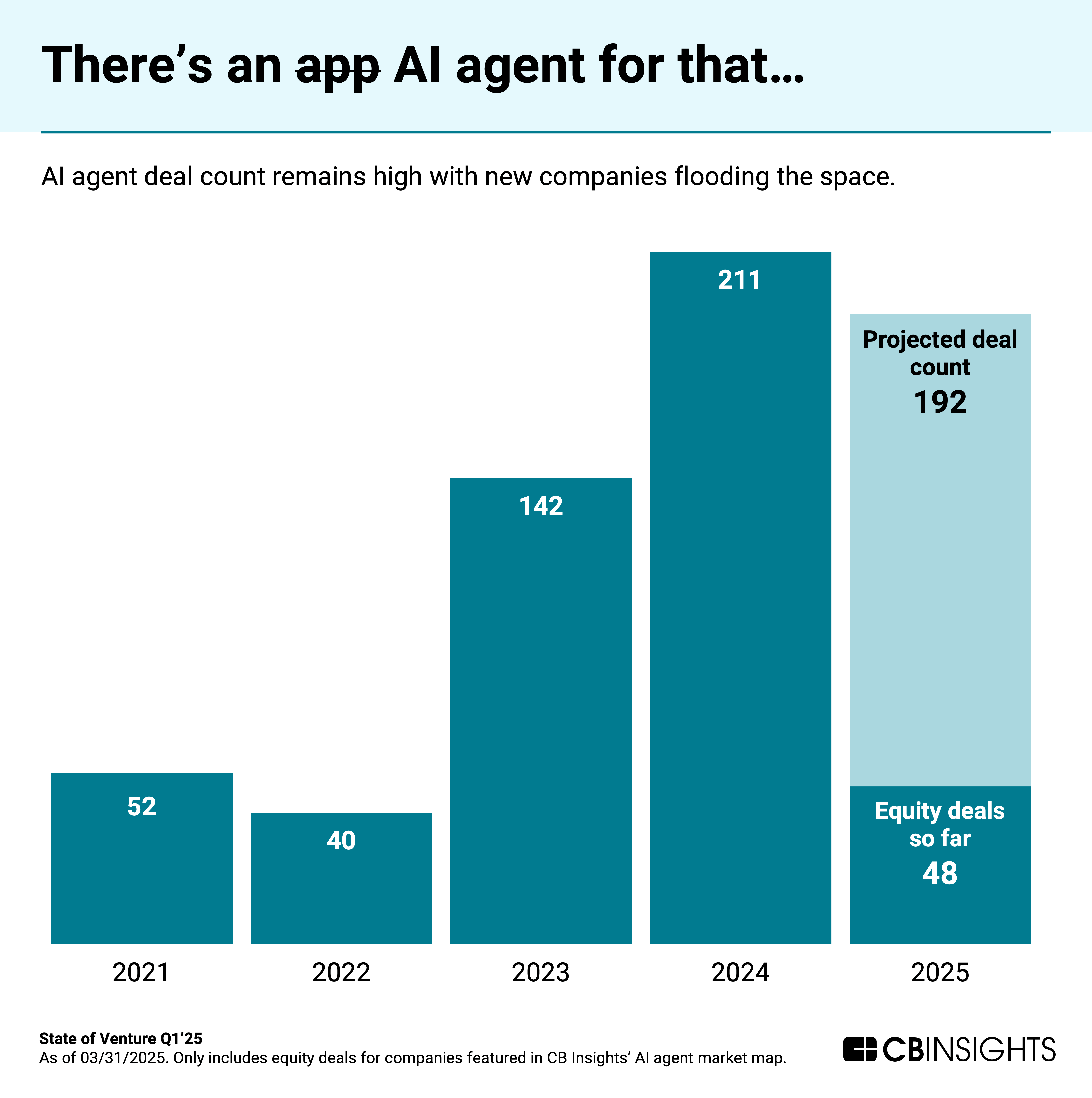 Investor interest is surging in parallel. AI agent startups saw more than 200 equity deals in 2024 — and activity is pacing toward similar levels this year.