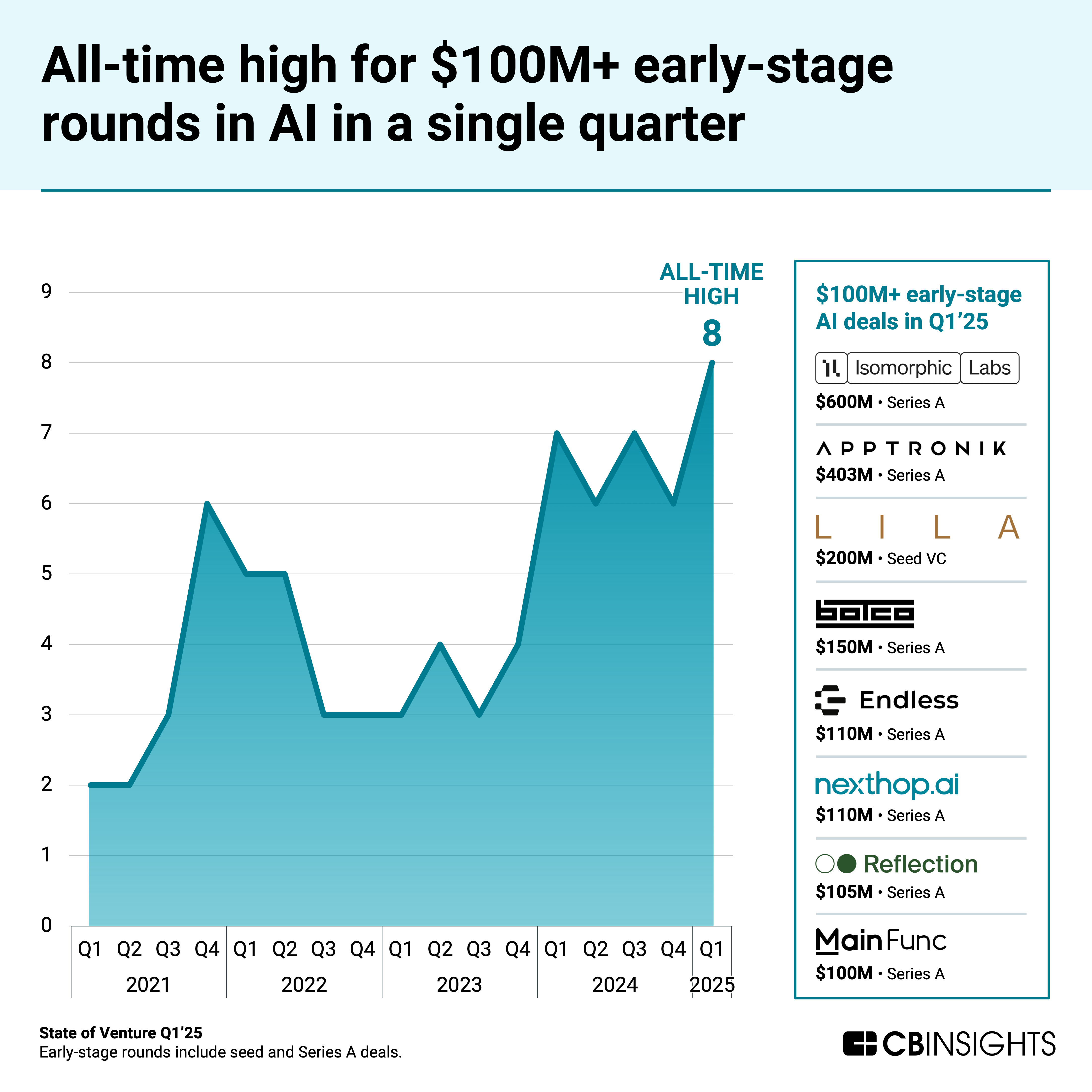 Q1’25 set a new record with 8 early-stage AI companies raising rounds of $100M or more. These 8 companies raised a combined $1.8B — with an average round size of $222M — highlighting investors’ willingness to place substantial bets on AI startups earlier than ever.