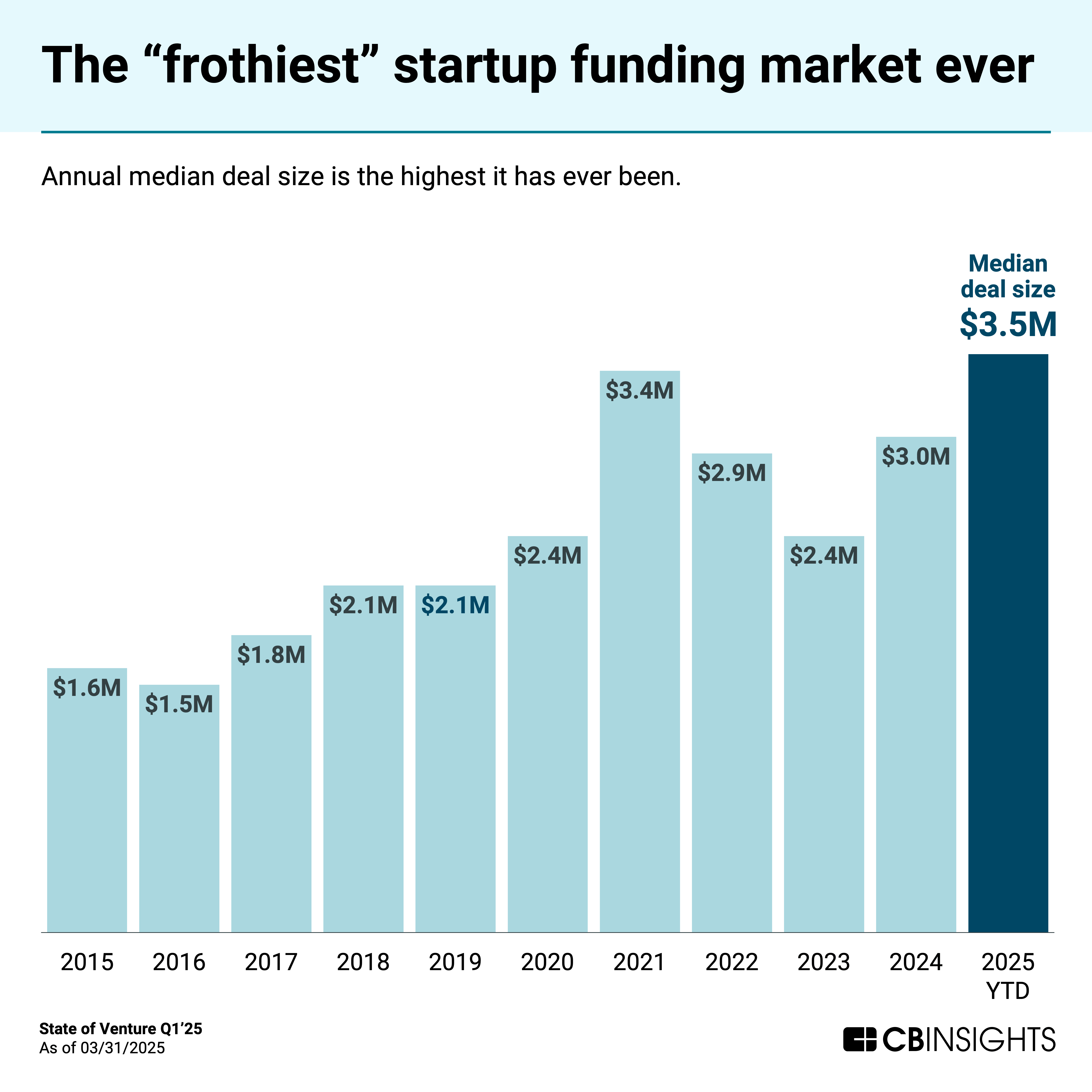 Opportunities across stages and geographies have fueled growth in deal sizes globally. So far in 2025, the median deal size sits at a record $3.5M.
