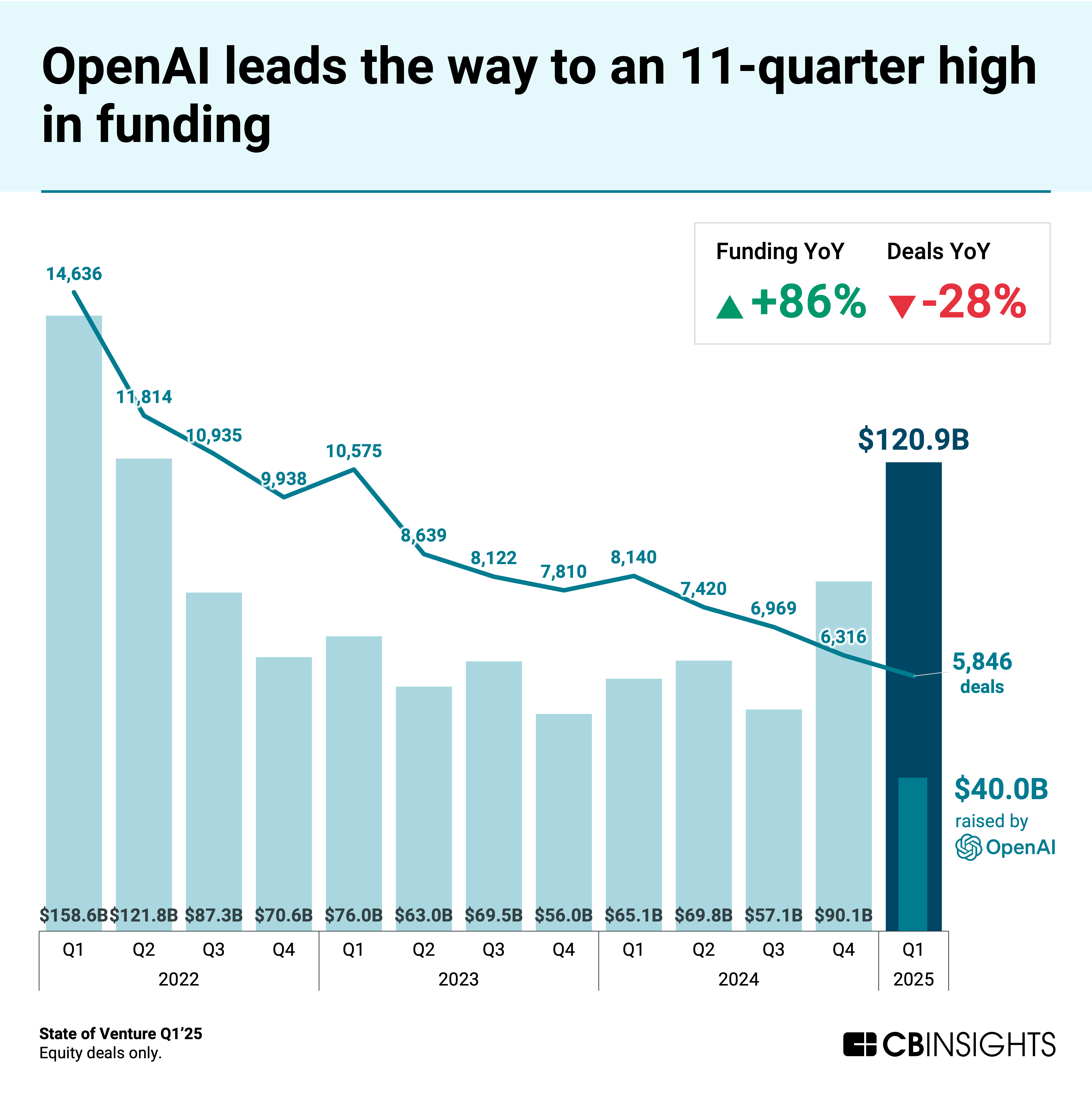 - Quarterly funding jumps to $121B, even as deal count keeps falling