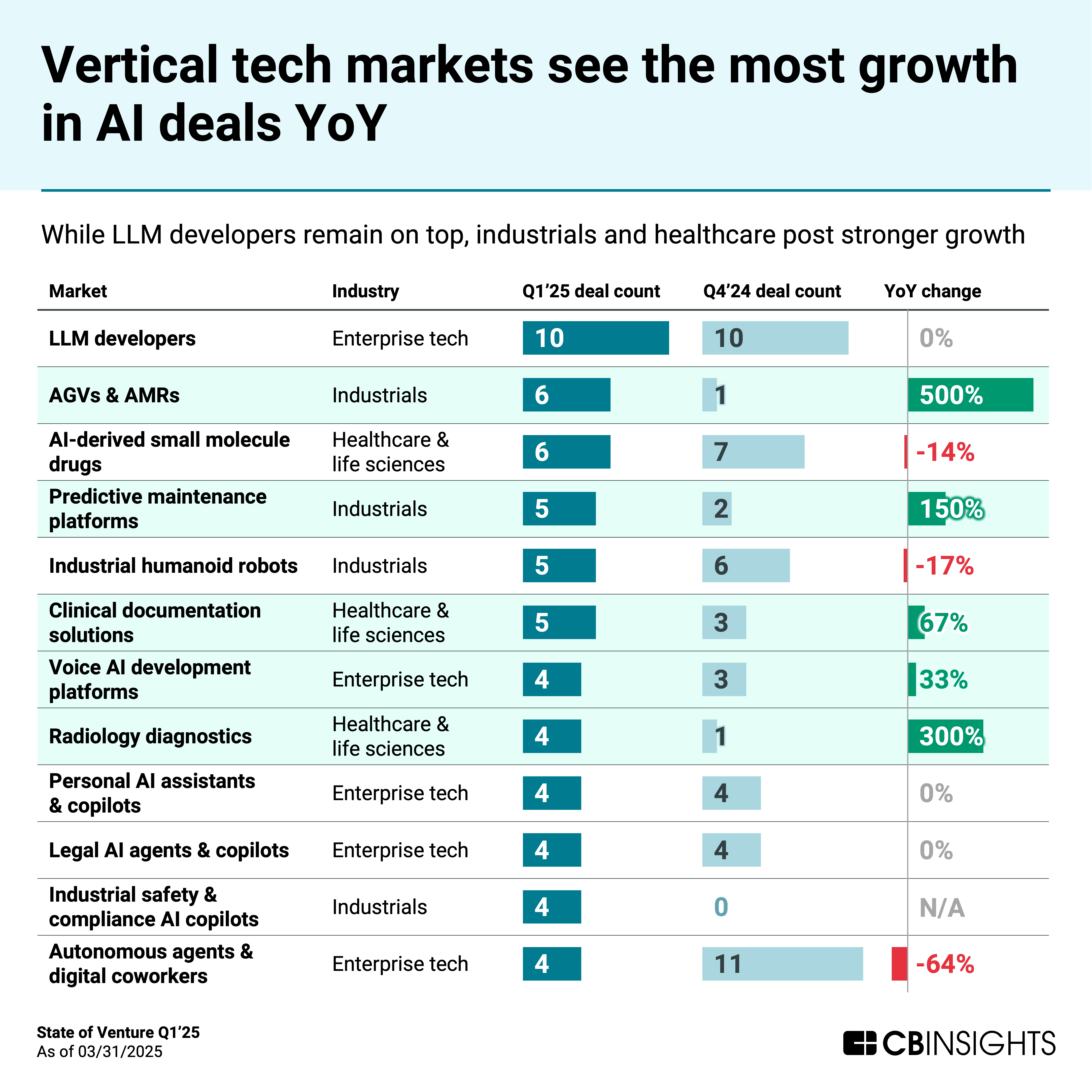 While LLM developers remain the top target for deals, they saw no growth in Q1’25 vs. Q1’24. On the other hand, vertical applications in industrials and healthcare — where AI is measurably improving automation — led in terms of YoY growth.