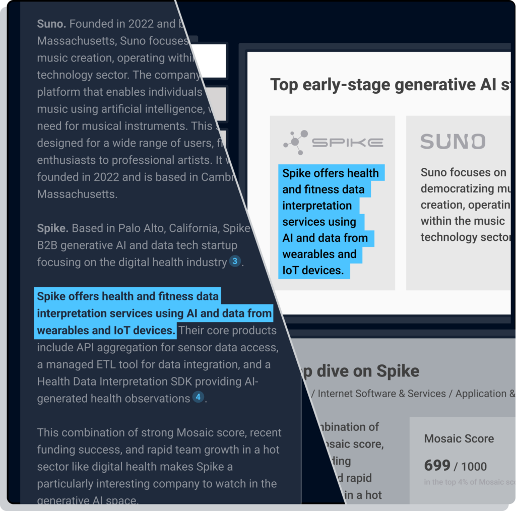Way beyond the Internet and public LLMs. Built on our proprietary database. Hundreds of millions of insights and documents on private and public companies – including revenue, company hiring insights, and exit probability.