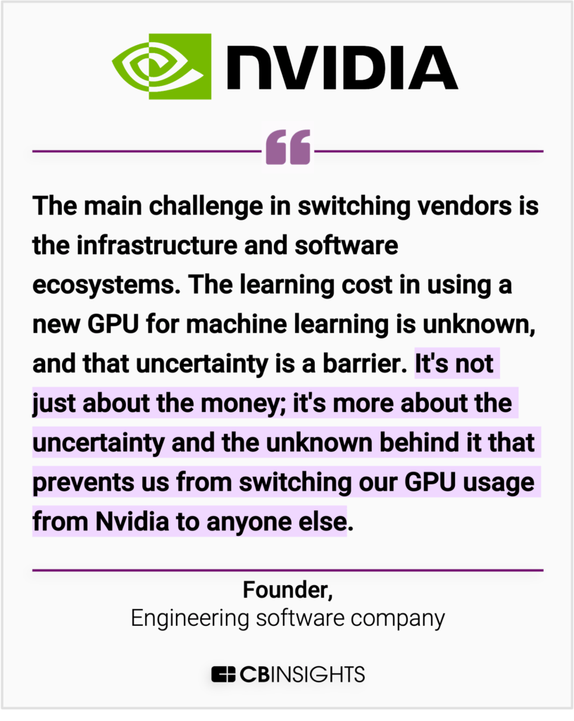 CB Insights customer sentiment interviews echo this lock-in. For example, one founder at a software engineering company mentioned “since all of our infrastructure is built on CUDA … the main challenge in switching … is the infrastructure and software ecosystems. The learning cost … is unknown, and that uncertainty is a barrier.”