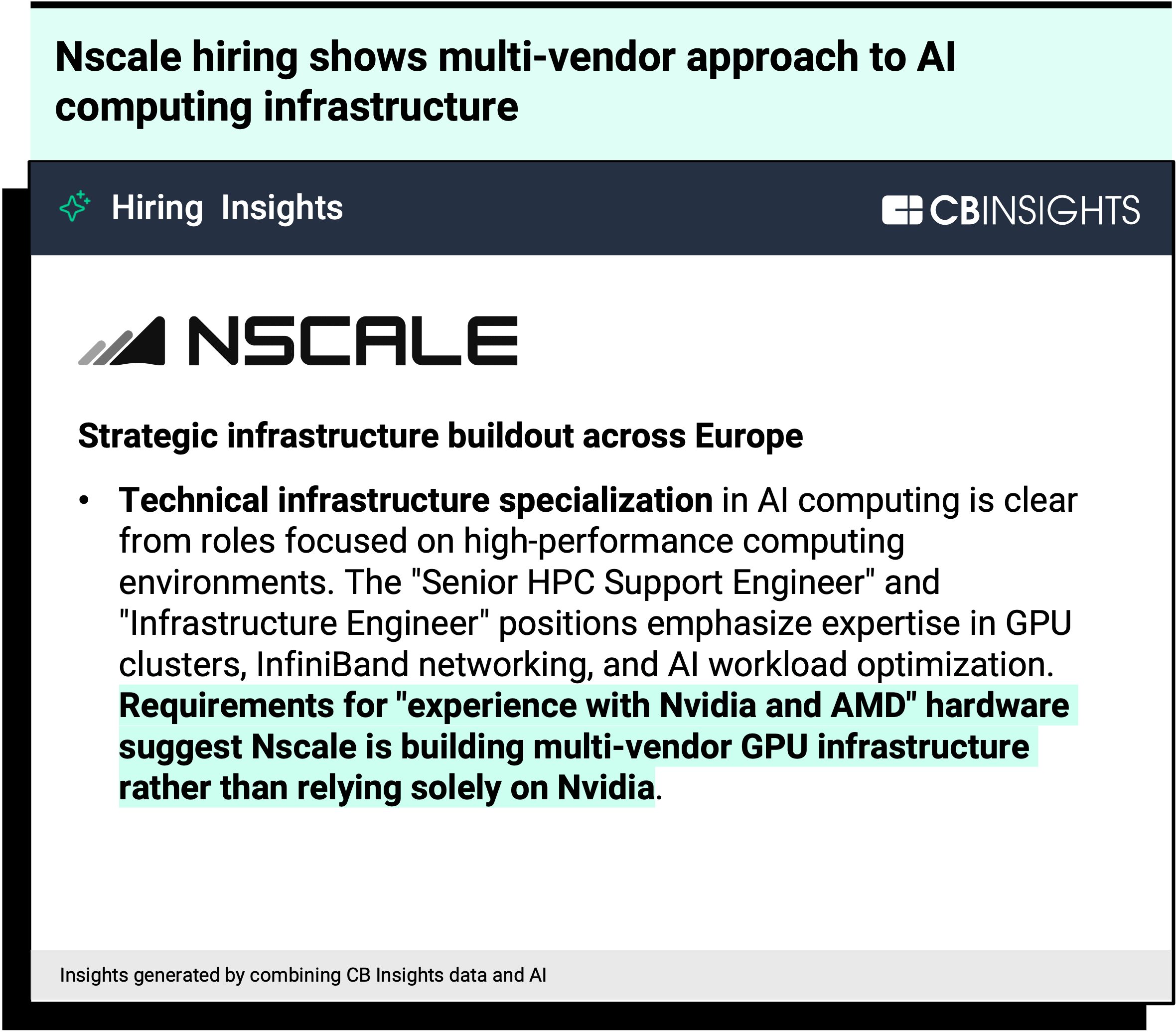 - Nscale, a data center hyperscaler, is hiring core infra roles that require “experience with Nvidia and AMD.” Nscale is positioning itself as a primary EU compute supplier, targeting data‑local workloads and a diversified supply chain that may shift some regional AI compute away from Nvidia.