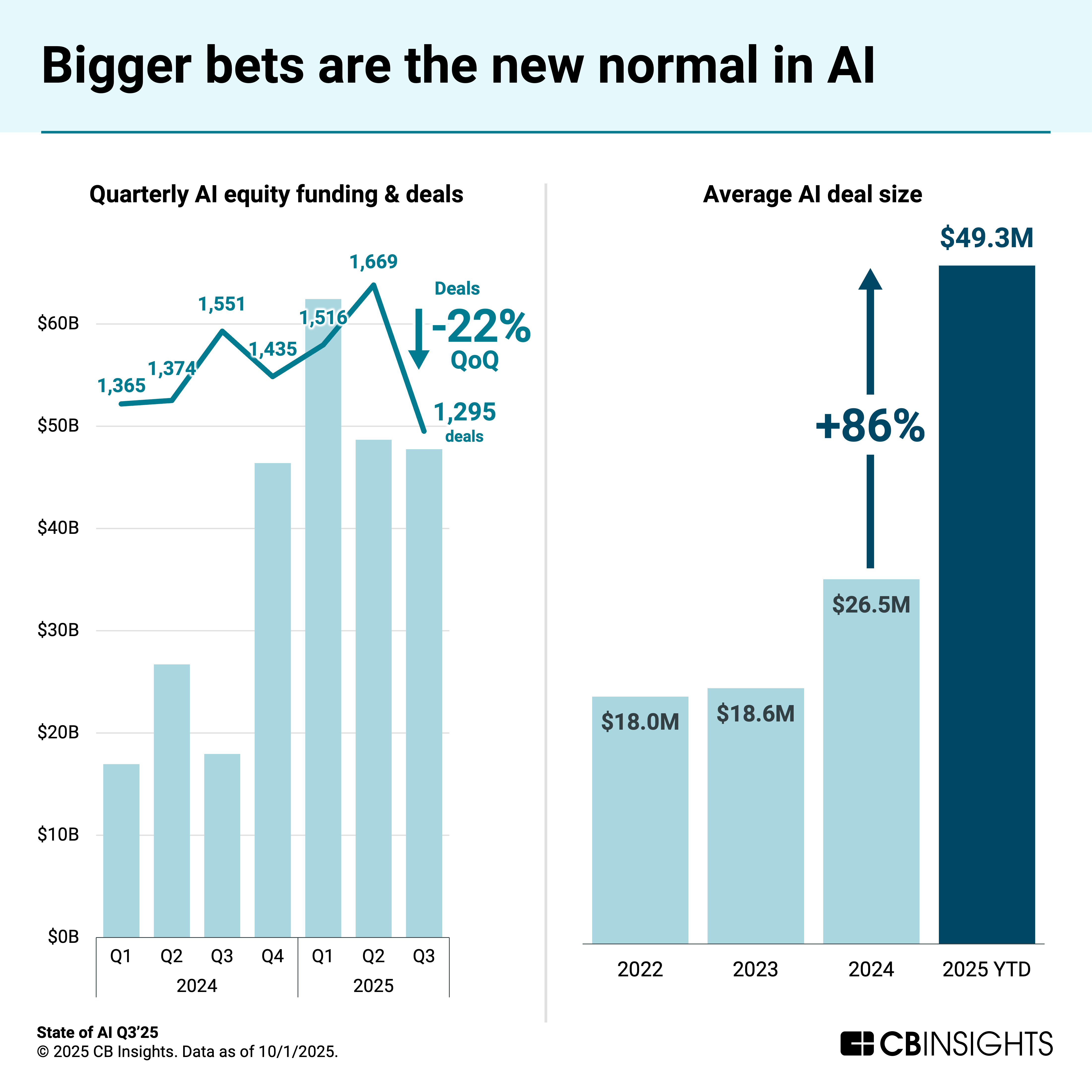 While deals fell in Q3’25, billion-dollar rounds to AI infrastructure players continued to drive the funding surge. But the activity isn’t limited to the largest players: investors are cutting bigger checks across every stage, signaling both conviction in AI’s potential and the high costs of AI development.