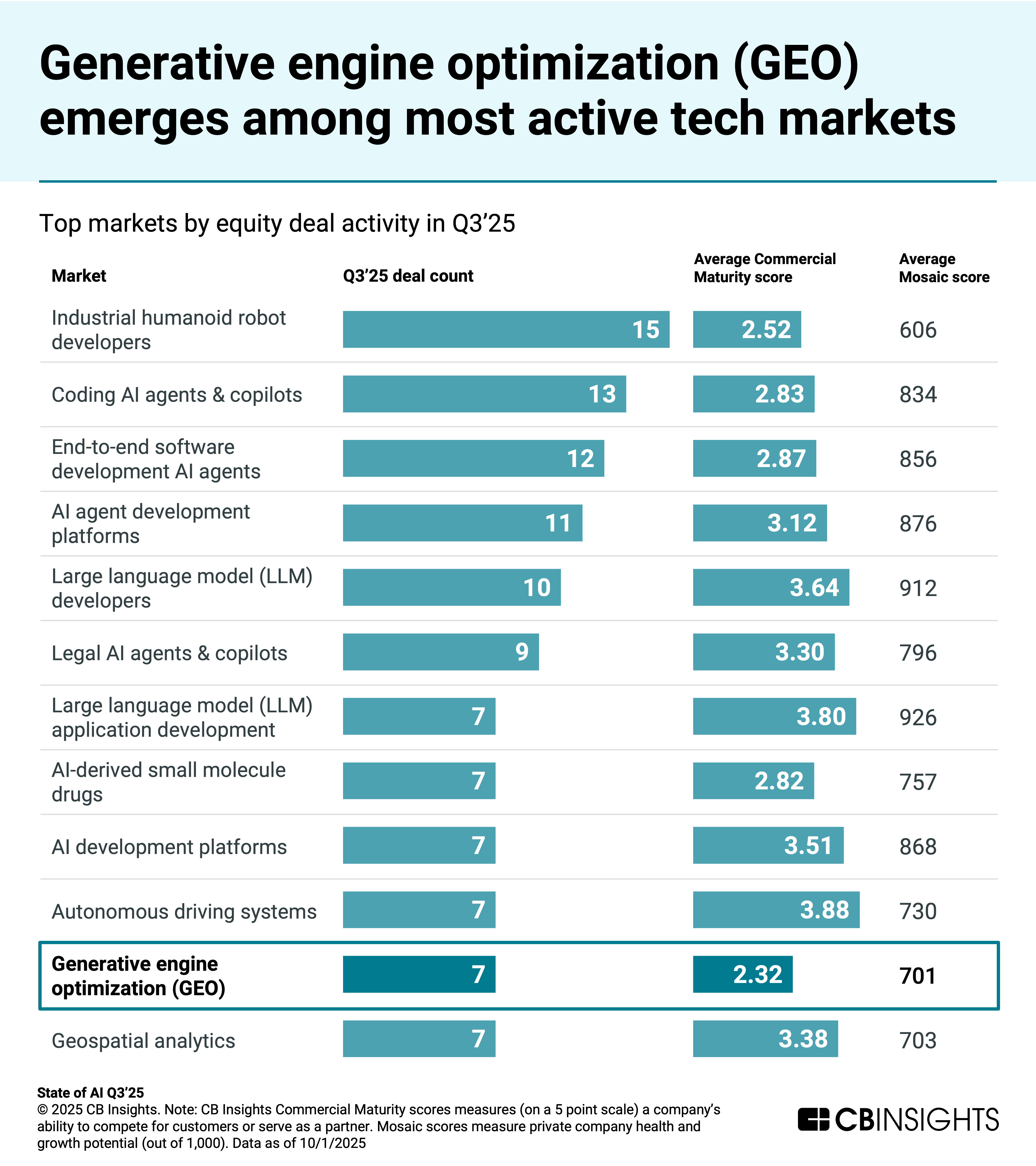 One notable rising market is generative engine optimization (GEO), which refers to tools that help brands optimize their visibility in AI search platforms like ChatGPT and Perplexity. This emerging category (the most nascent in the list based on CBI Commercial Maturity scores) addresses the shift toward shopping and discovery happening on top of LLM interfaces.