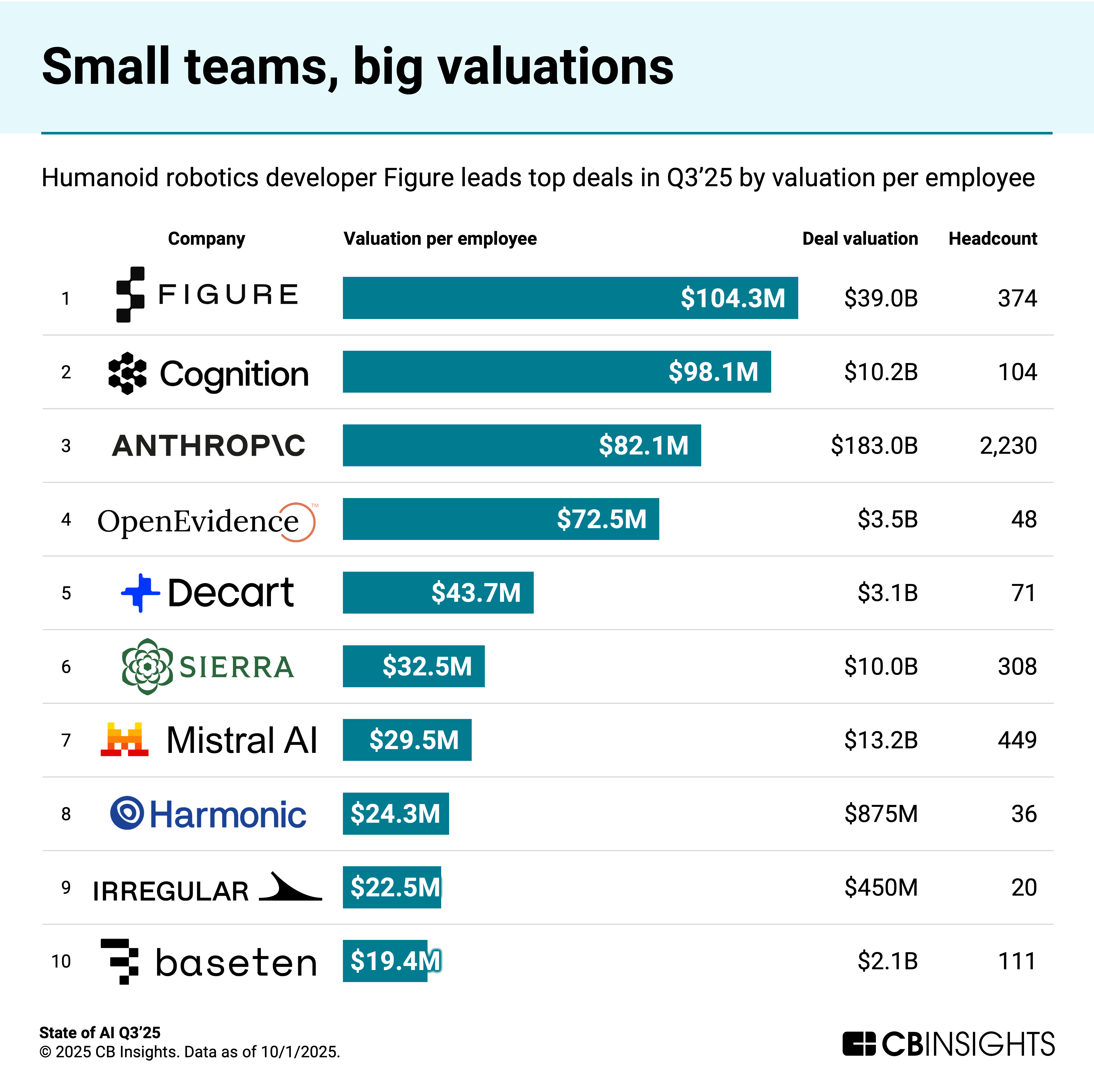 Others topping the quarter’s valuation-per-employee list span the AI model (Anthropic, Mistral AI, Decart, Harmonic), infrastructure (Baseten), and application layers (OpenEvidence, Sierra, Irregular).