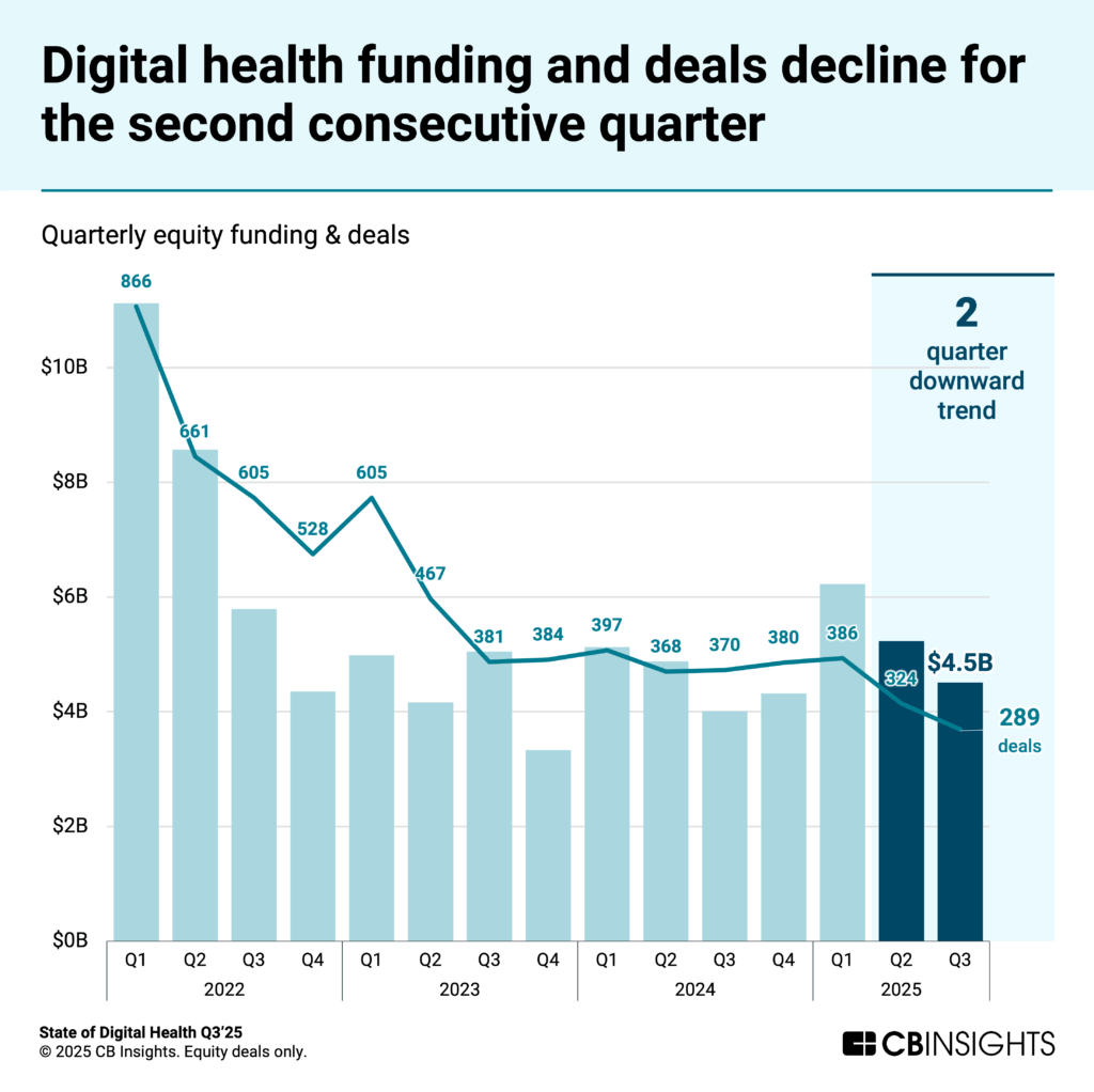 Digital health equity funding dropped 14% QoQ in Q3’25, while deal volume fell 11% to its lowest level in 5 years with 289 deals.