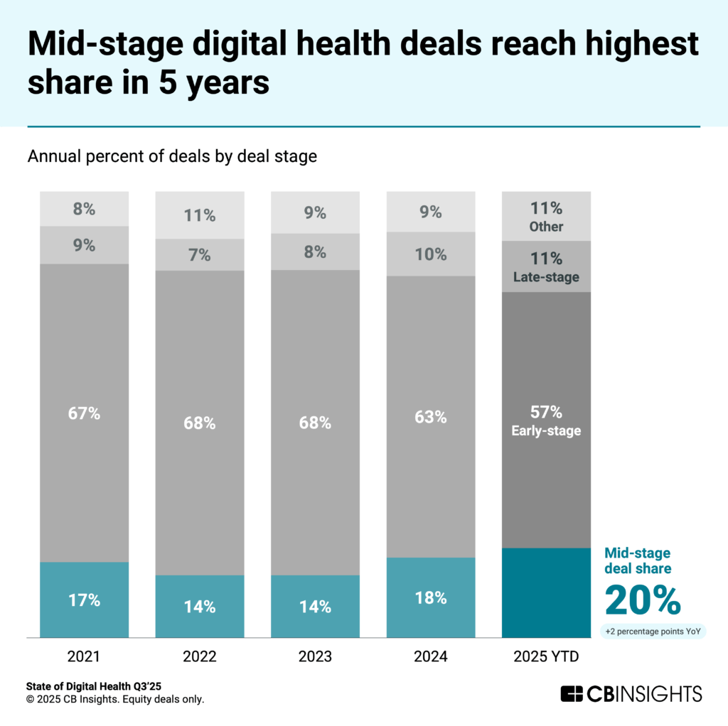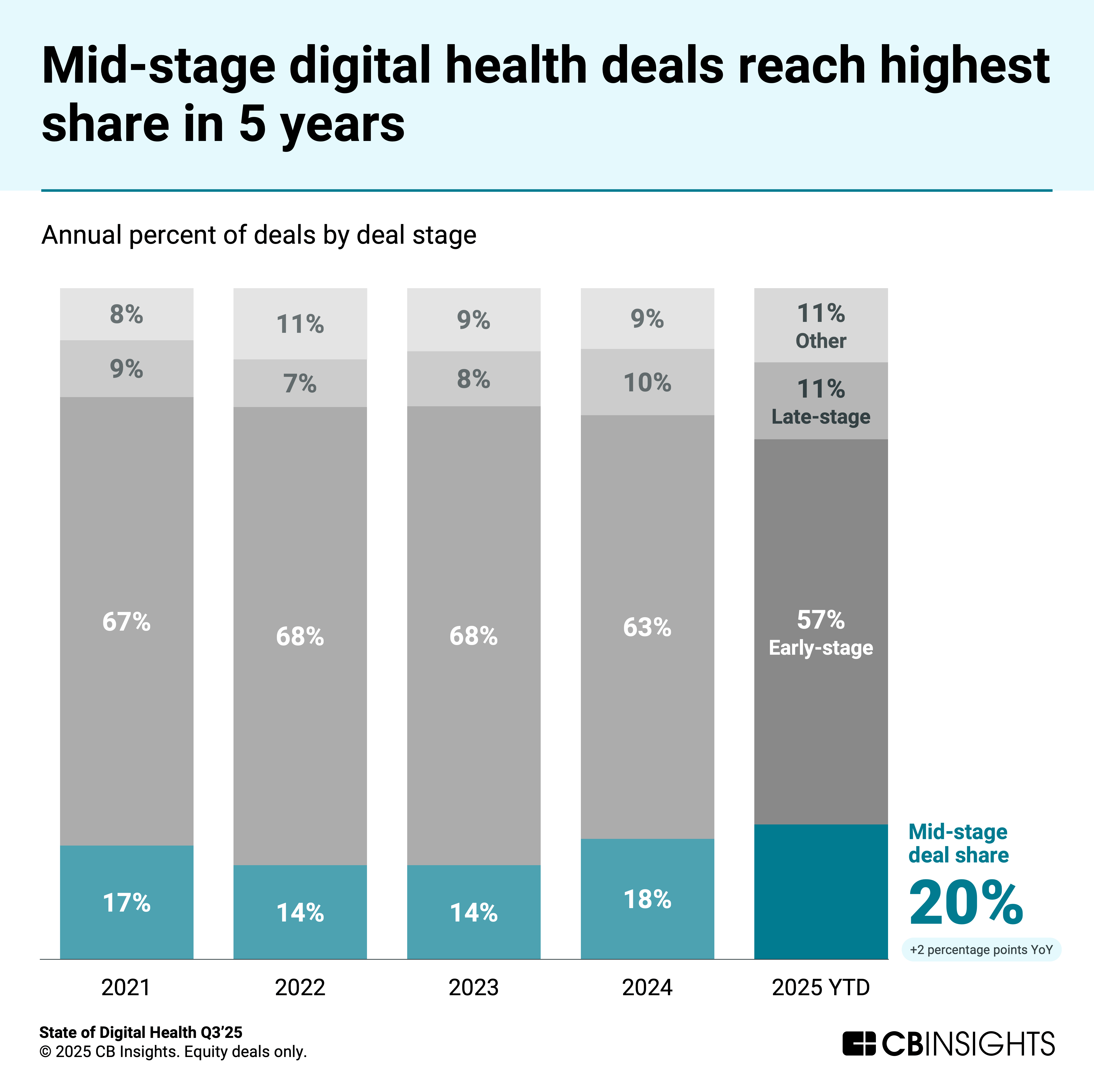 Investors are shifting their focus toward more mature companies. Mid-stage deals captured 20% of all digital health deals in 2025 YTD, up from 18% in 2024 — the highest proportion in 5 years. The shift signals investors’ growing preference for companies with established revenue streams and proven market traction.