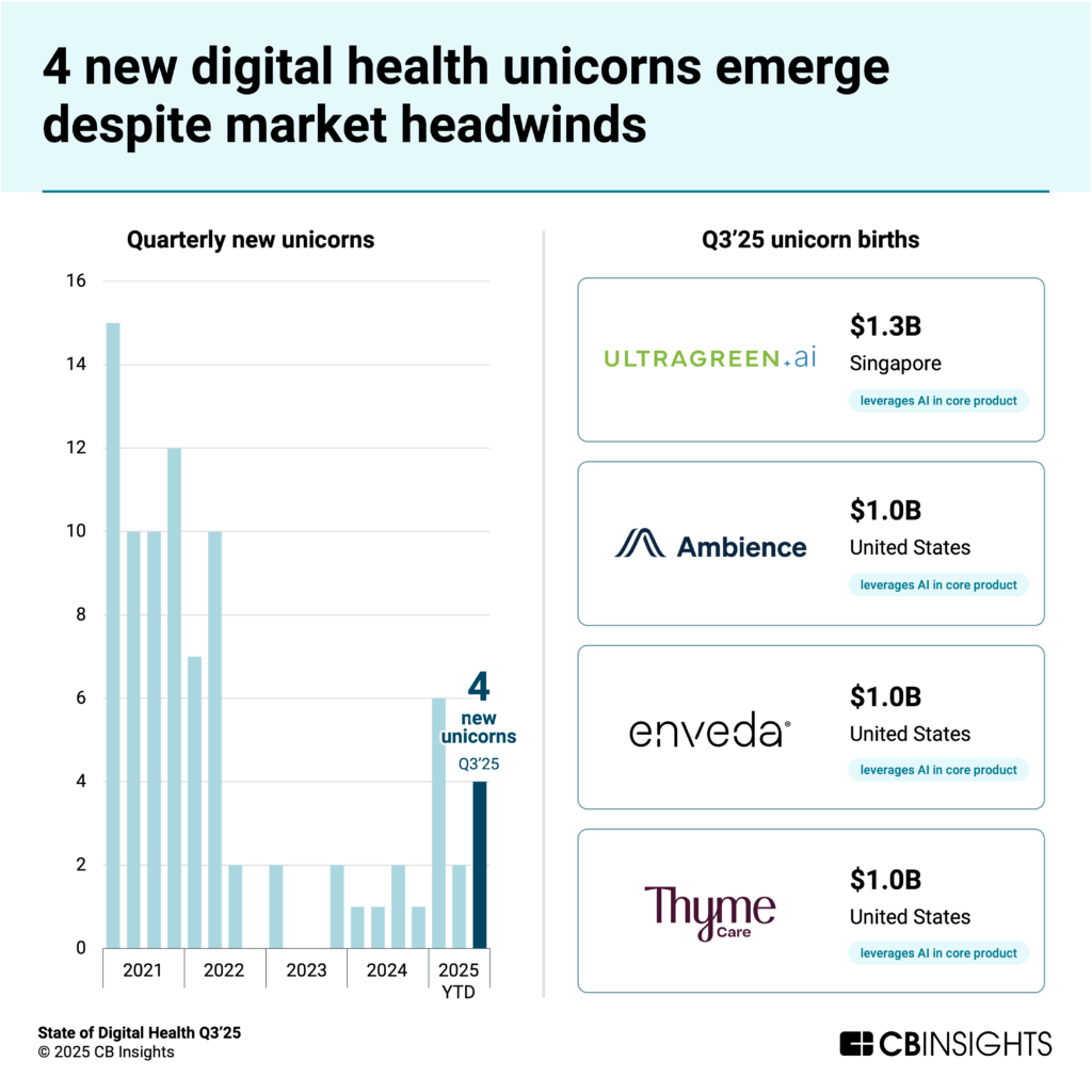 - All 4 new unicorns provide AI-enabled solutions. Four new unicorns were born in Q3’25 (3 in the US, 1 in Asia), doubling the count from Q2’25. All four of these unicorns leverage AI in their core products, from life sciences platforms like Enveda (drug discovery) to clinical tools like Ambience (clinical documentation) and UltraGreen (fluorescence-guided surgery).