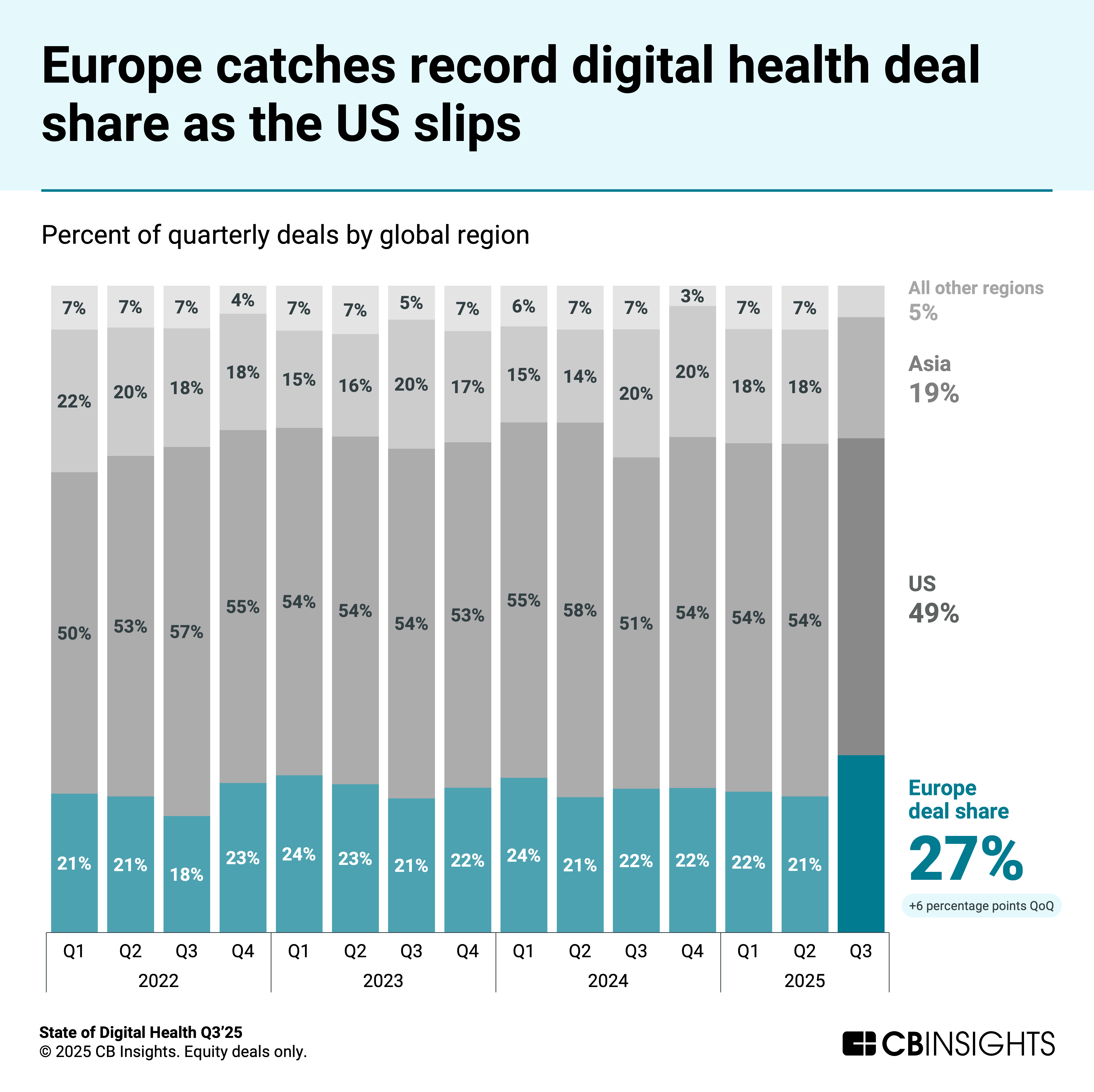 Geographic shifts in digital health dealmaking became pronounced in Q3’25, with Europe capturing 27% of global deal share—the highest in nearly 5 years. Meanwhile, US deals declined to 49%, the lowest share since Q4’21. Asia held steady at 19% this quarter compared to 18% in Q2’25.